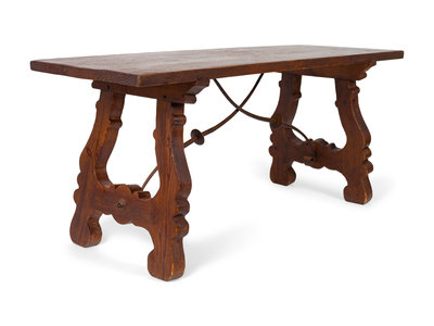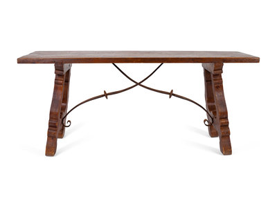 A Spanish Colonial Style Trestle Table With Wrought Iron Stretcher