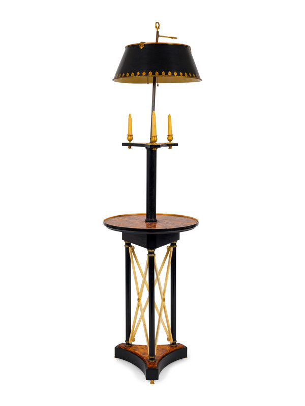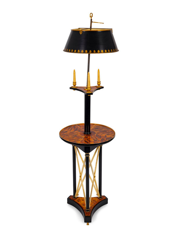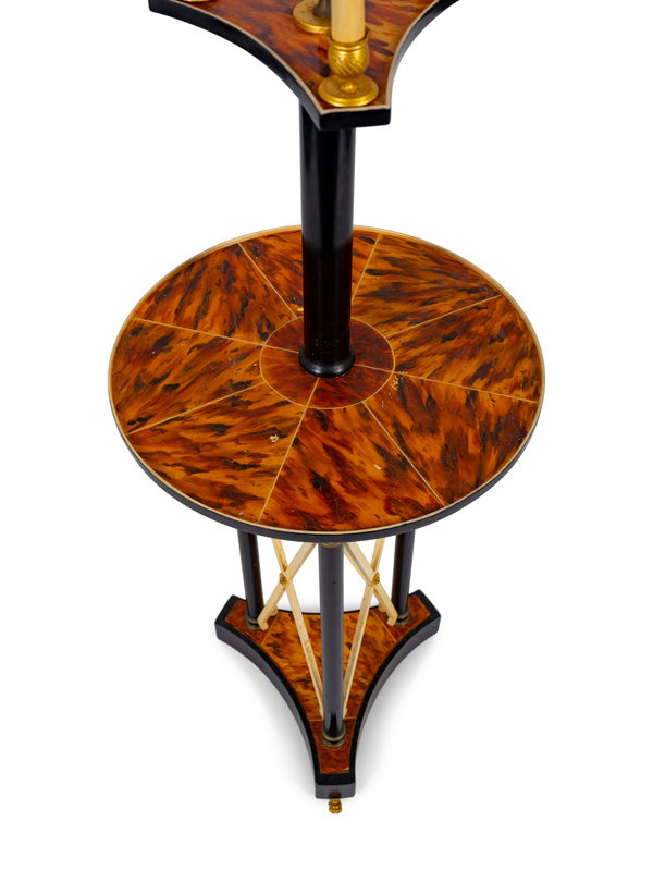 A Neoclassical Style Faux Tortoiseshell and Ebonized Tole Floor Lamp with Table
