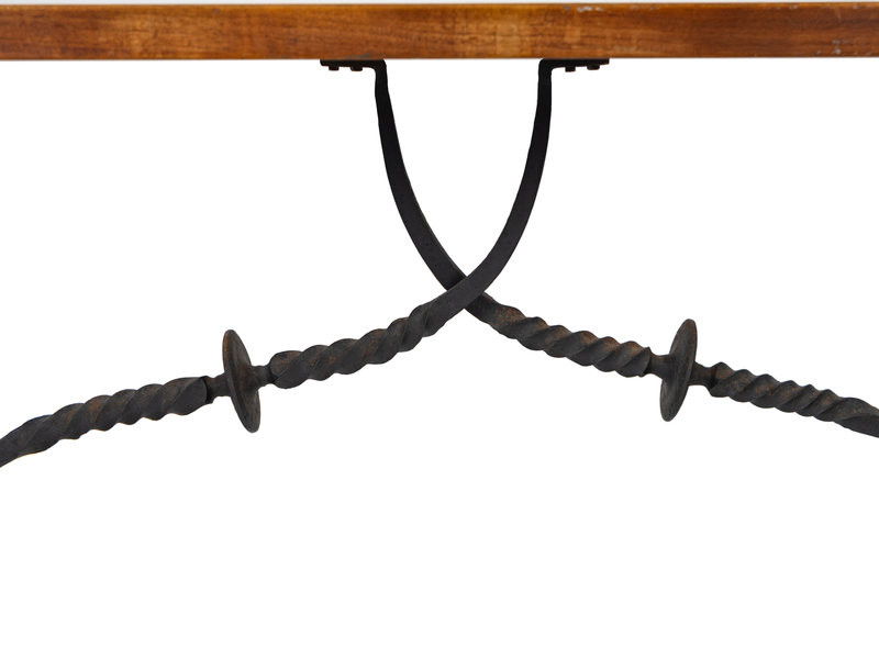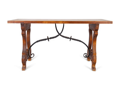 A Spanish Colonial Style Walnut Trestle Table with Wrought Iron Stretcher