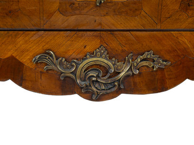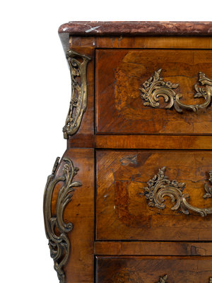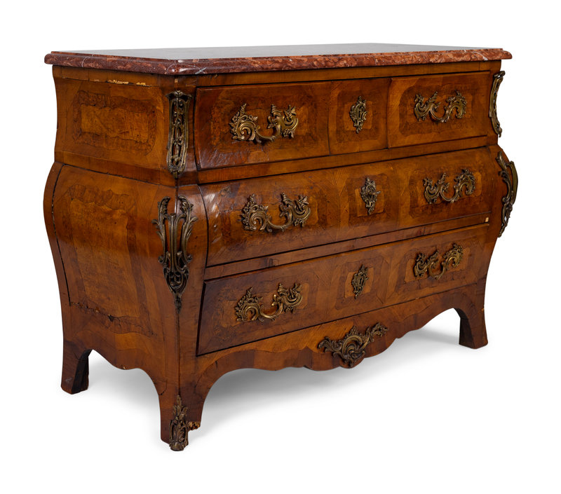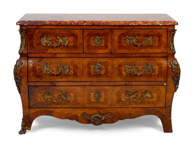A Regence Style Gilt Bronze Mounted Marquetry Walnut Rouge Marble Top Commode en Tombeau