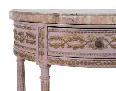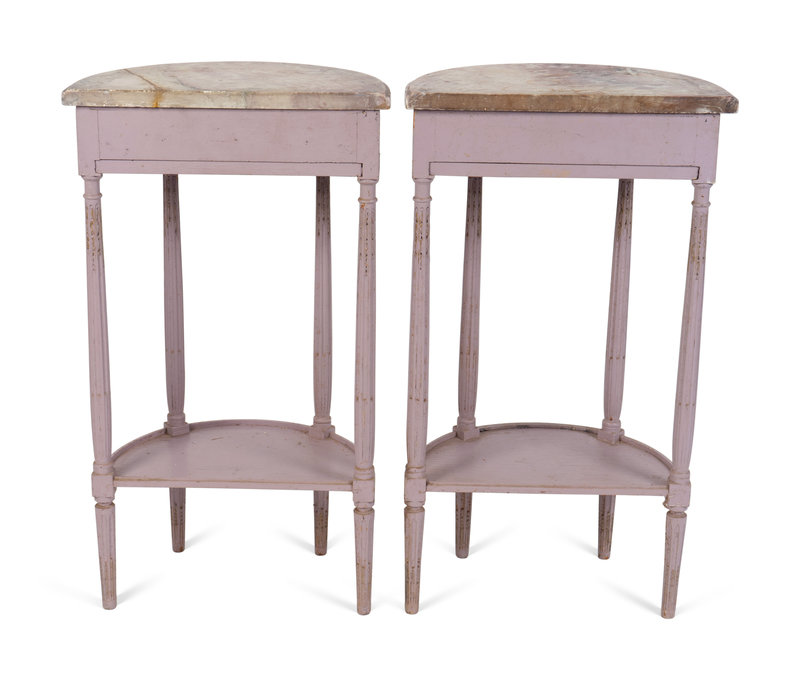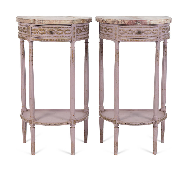A Pair of Louis XV Style Painted Demi-lune Marble Top Console Tables