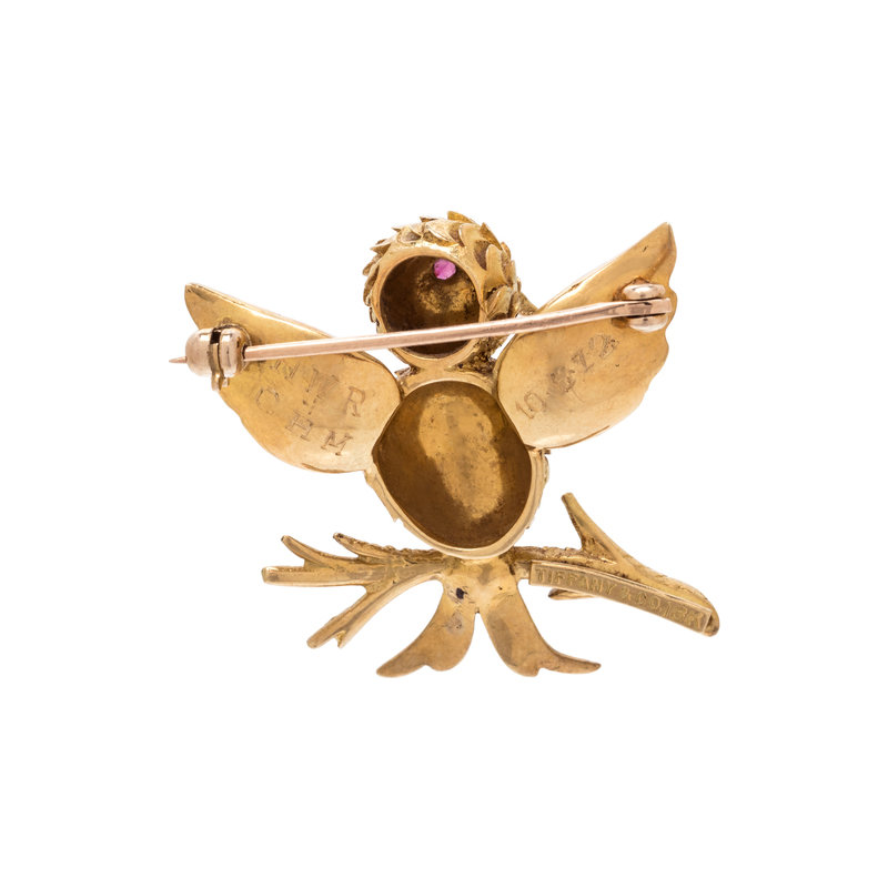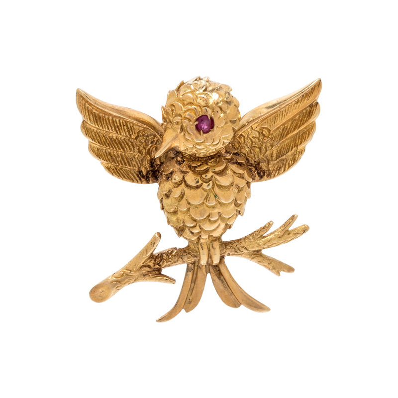Consisting of a textured gold bird on a branch with one round mixed cut ruby eye. 1 1/8 x 1 1/8 inches.