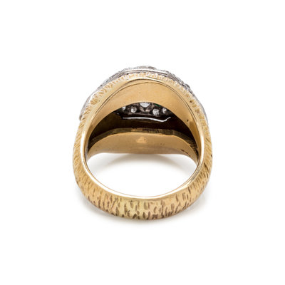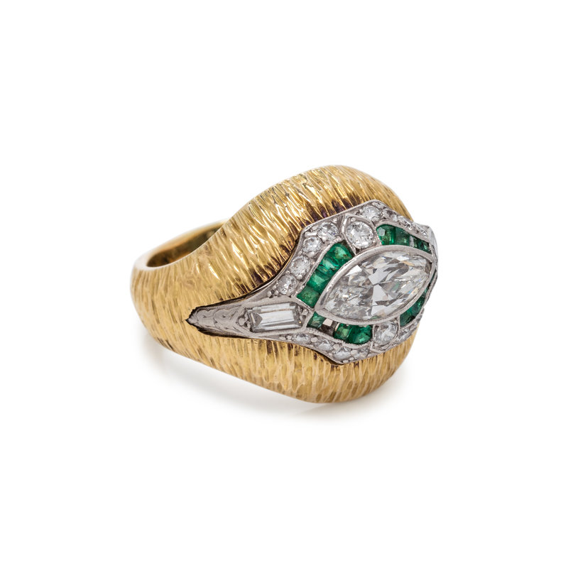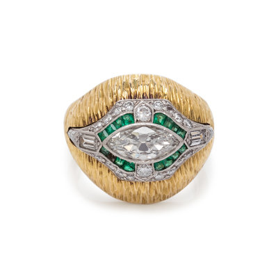 Consisting of a platinum Art Deco ring containing one marquise cut diamond weighing approximately 0.95 carat, two baguette cut diamonds, 18 old European and round brilliant cut diamonds and 15 calibre cut emeralds, with attached textured gold ring jacket. Ring size 6 1/4.