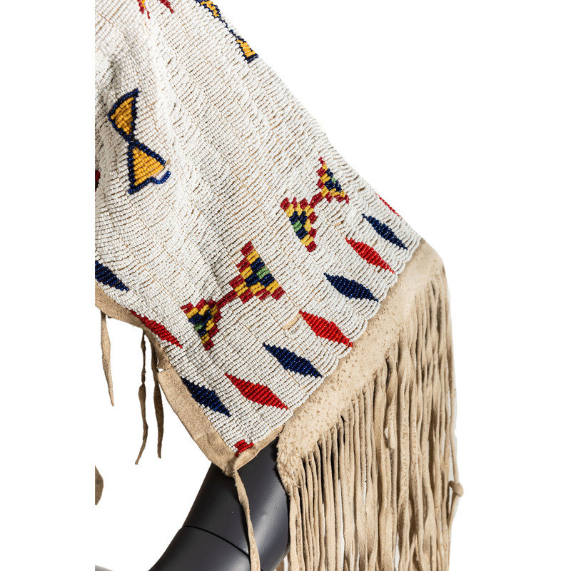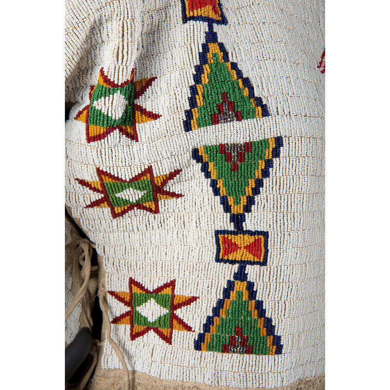 thread-sewn on softly tanned hide; yoke beaded using colors of apple red white-heart, dark blue, white, pea green, yellow, and metallic