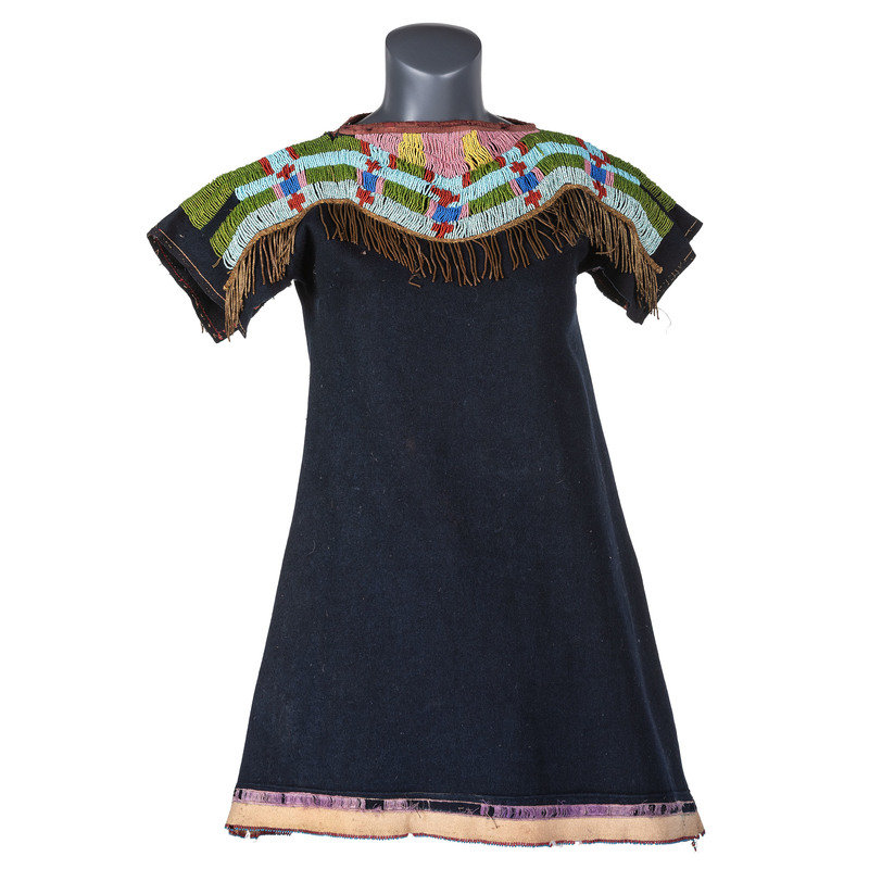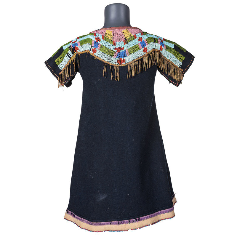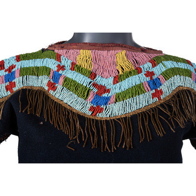 thread-sewn; yoke with metallic fringe is also beaded using colors of medium blue, pink, apple red white-heart, translucent green, and greasy yellow
