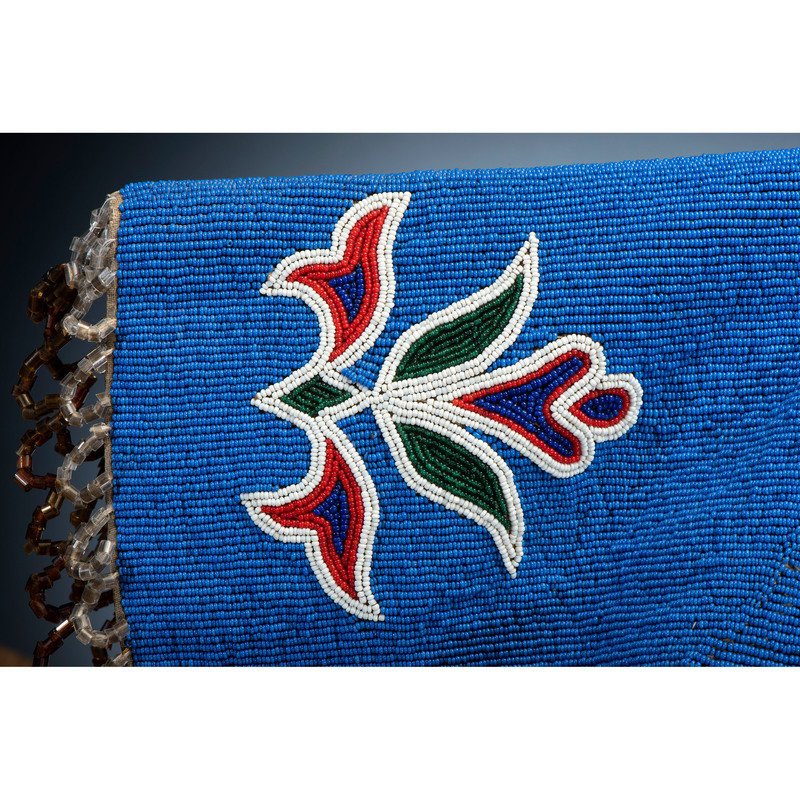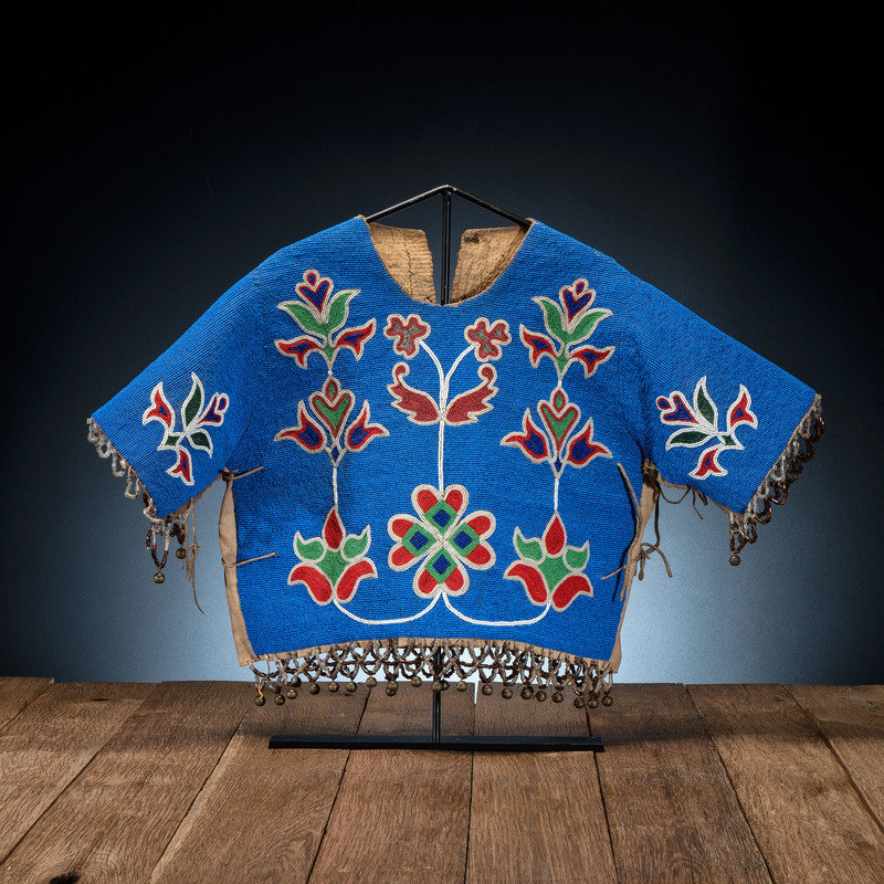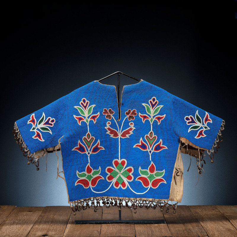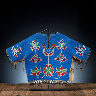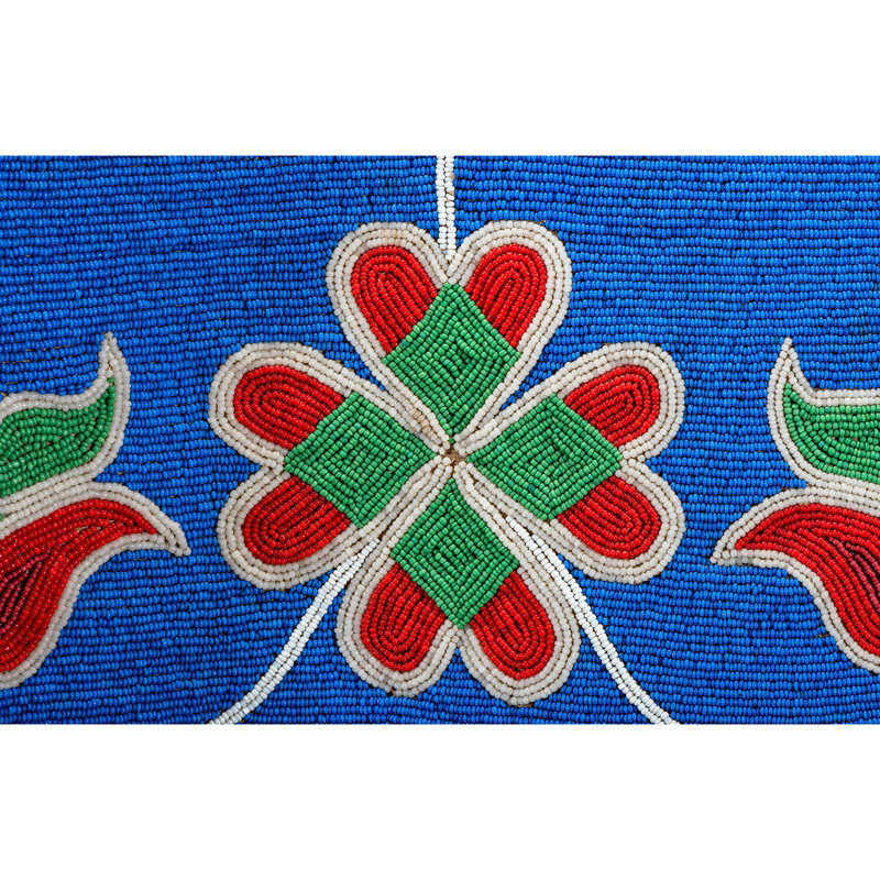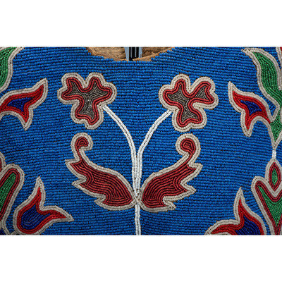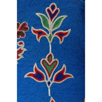 thread-sewn on canvas, featuring a floral design beaded in colors of white, pea green, red-orange, red white-heart, royal, blue, and forest green on a periwinkle background; basket beads and brass bells along sleeves and lower hem