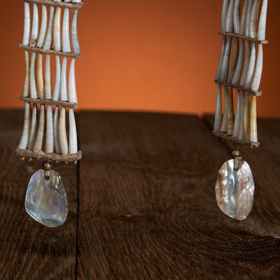 shells are strung with sinew strands and separated by rawhide spacers