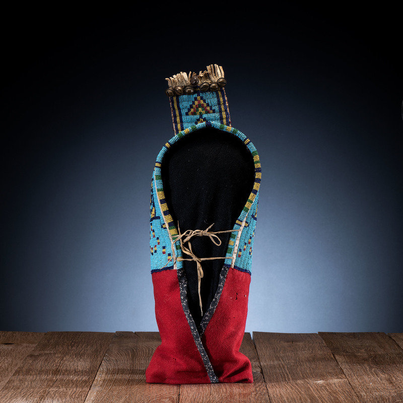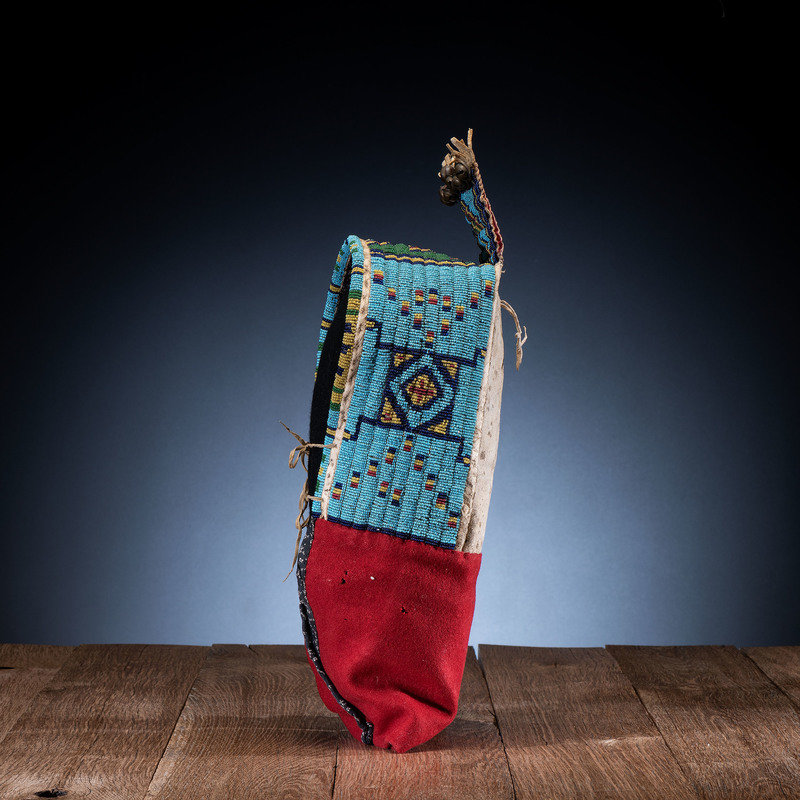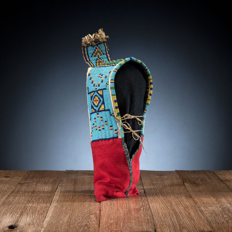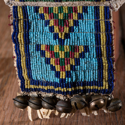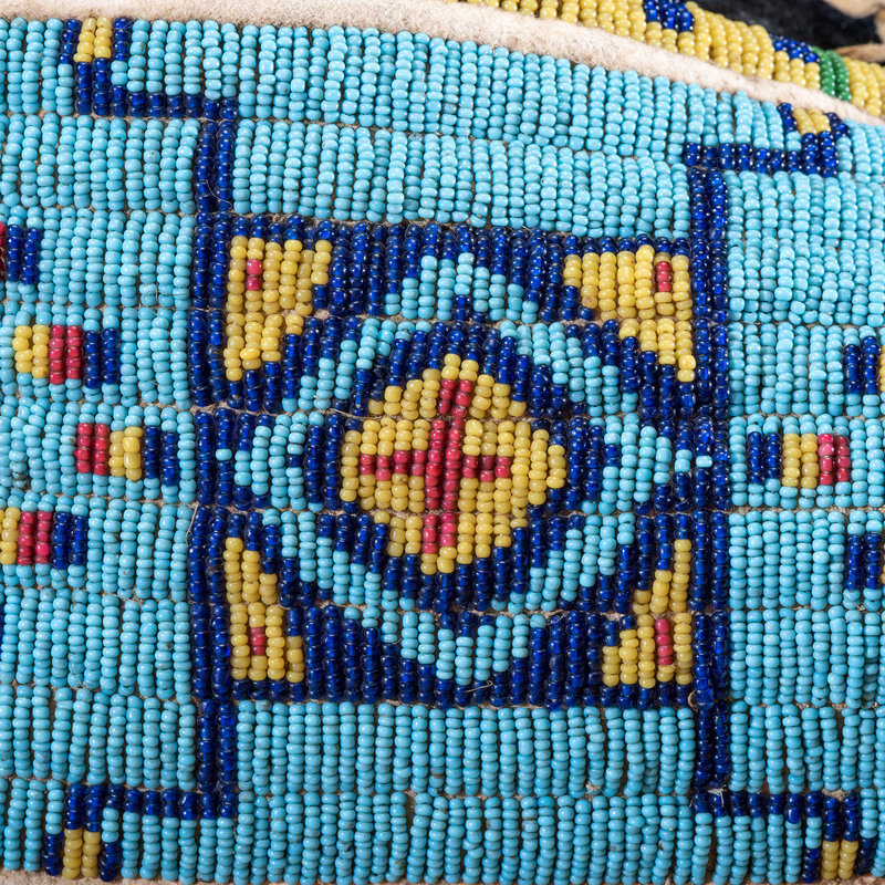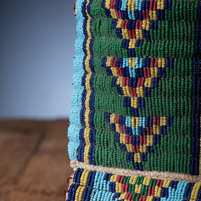 blue beaded background, with yellow, deep blue, green and red white-heart beads, red trade cloth on the bottom