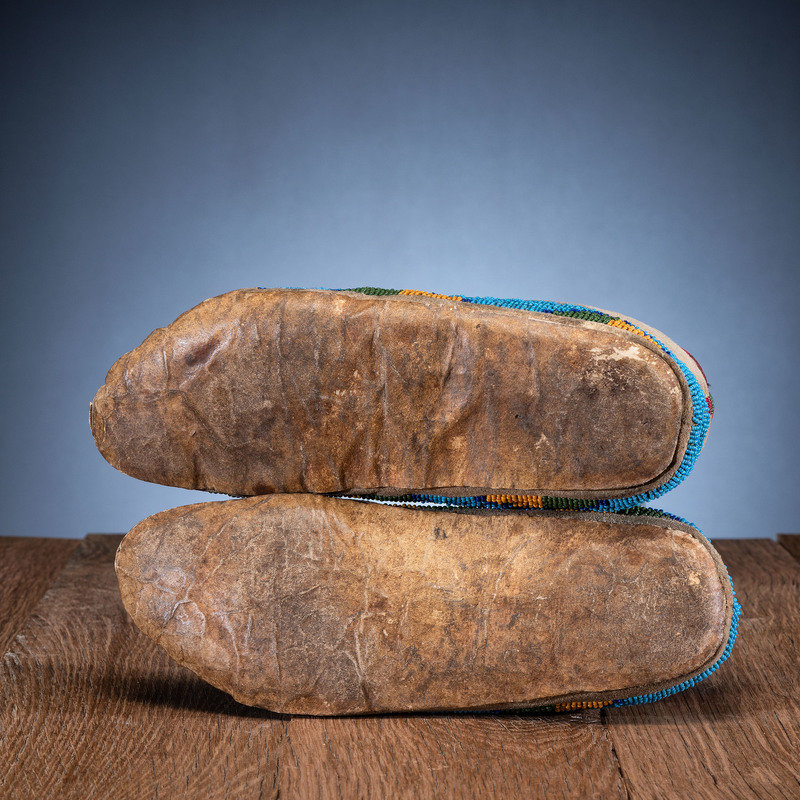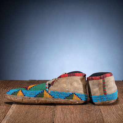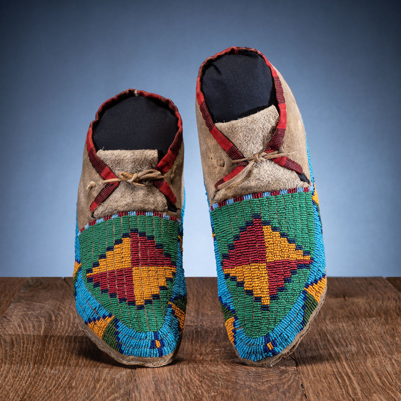sinew-sewn on soft hide with checked red cotton cuffs; vamps having a brightly beaded geometric pattern using colors of red white-heart, greasy orange, cobalt, pea green, sky blue, and navy blue