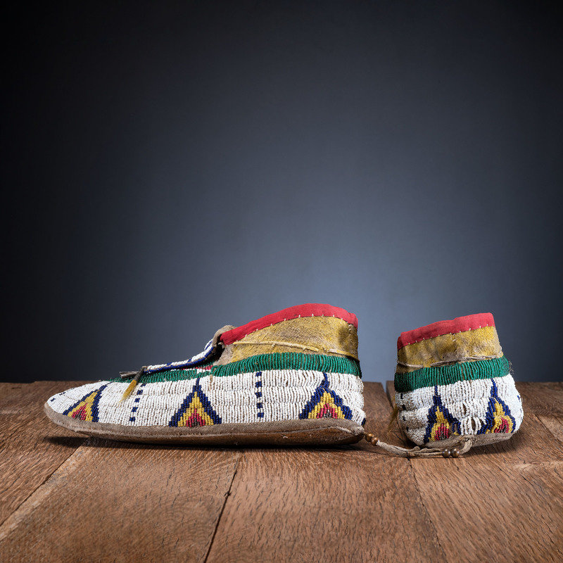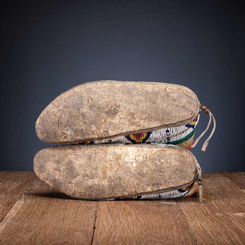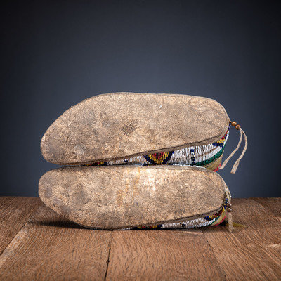 sinew-sewn and beaded using colors of translucent green, dark blue, greasy yellow, and metallic; split tongues with tin cones and yellow-dyed horse hair; hide retains yellow pigment