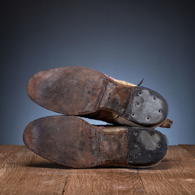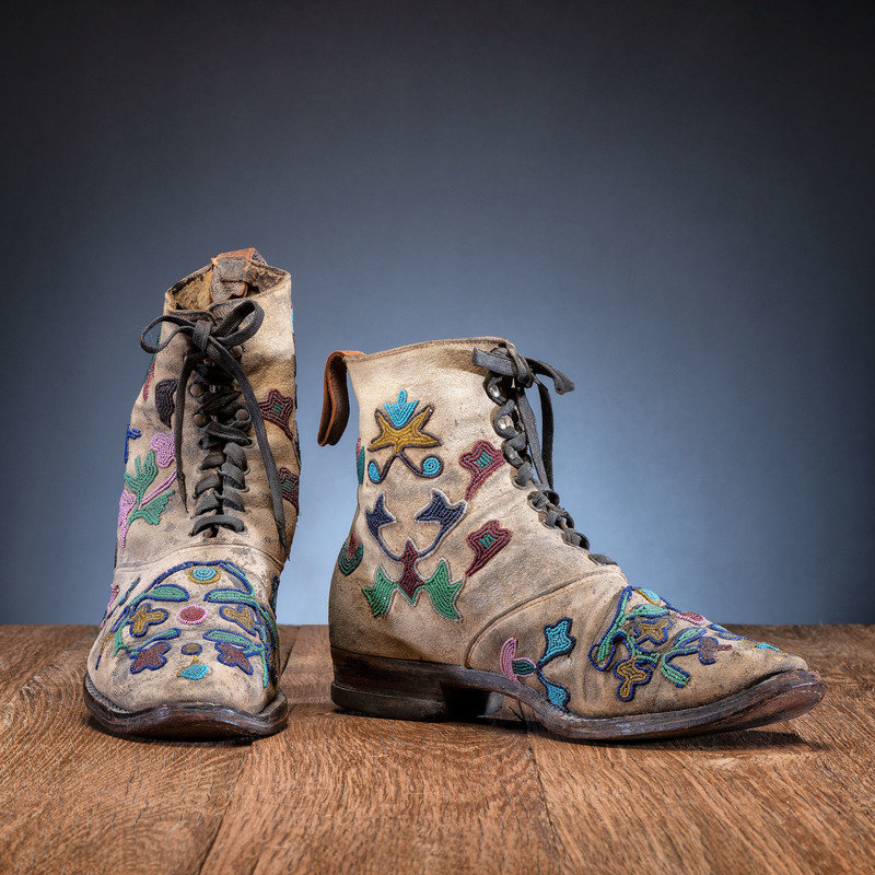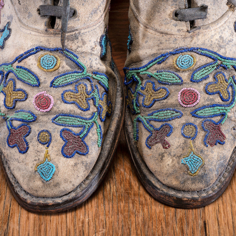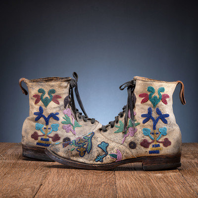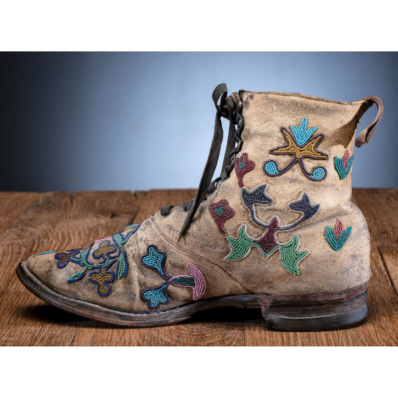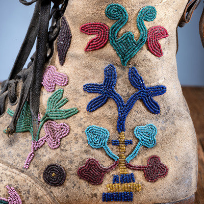 European-style boot beaded with a floral pattern in colors of pink, pea green, dark blue, amber, and Charlotte-cut red white-heart and translucent green