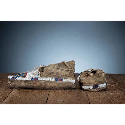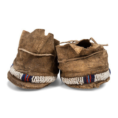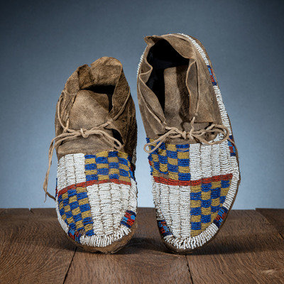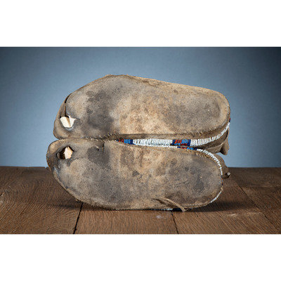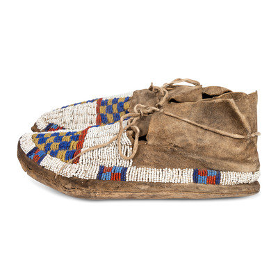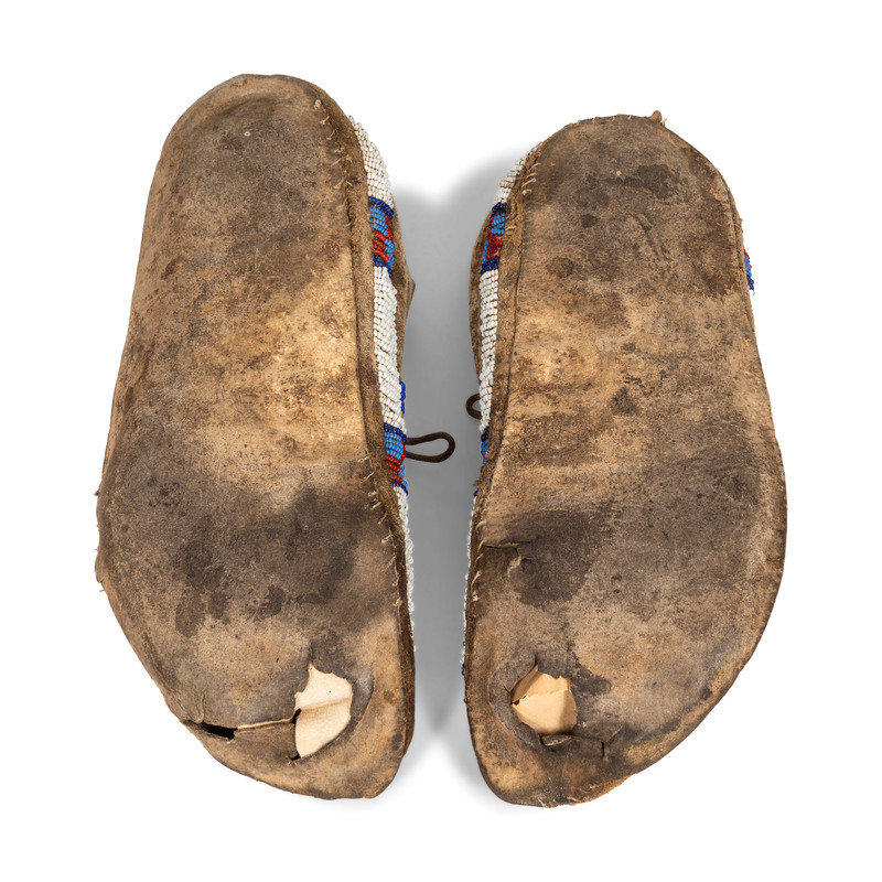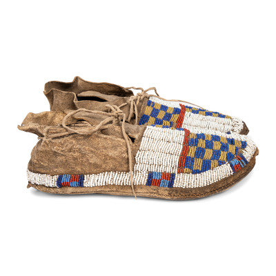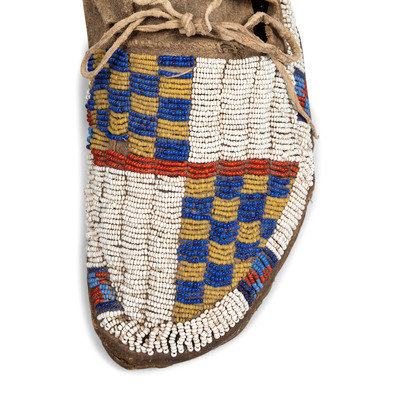 sinew-sewn and beaded using colors of greasy yellow, dark blue, white, and red white-heart creating a unique checkered pattern on vamps