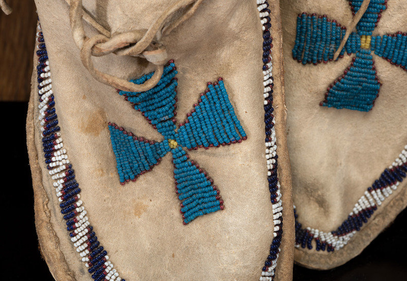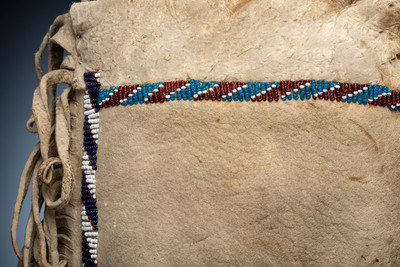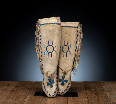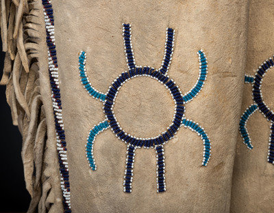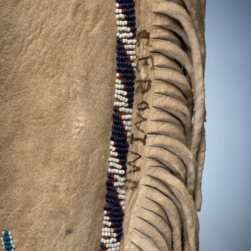 thread and sinew-sewn on soft, thick hide; fringed outer seam; beaded lanes along with sun and cross motifs in colors of greasy blue, navy blue, white, and translucent burgundy; signed along the outer edge