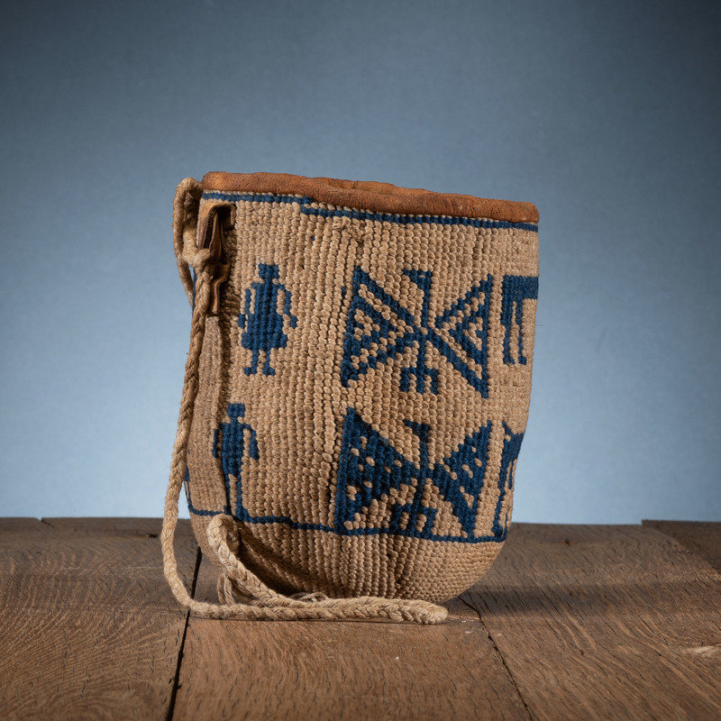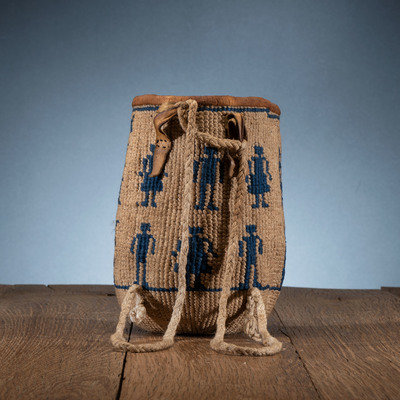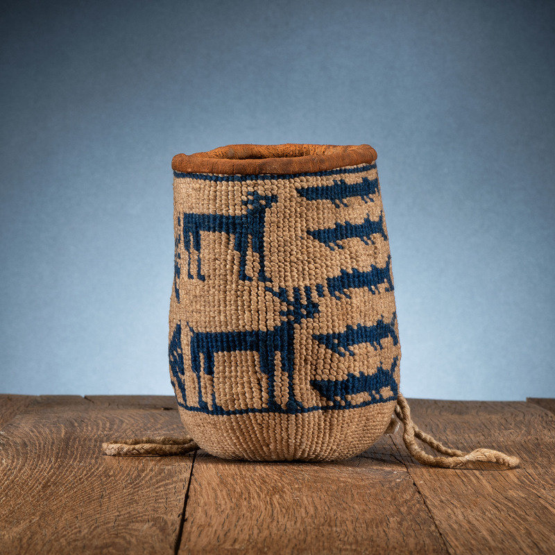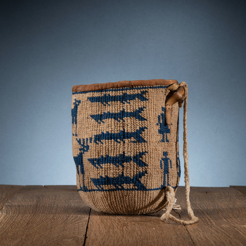 decorated in navy yarn with five sturgeon, two condors, two elk, and six humans