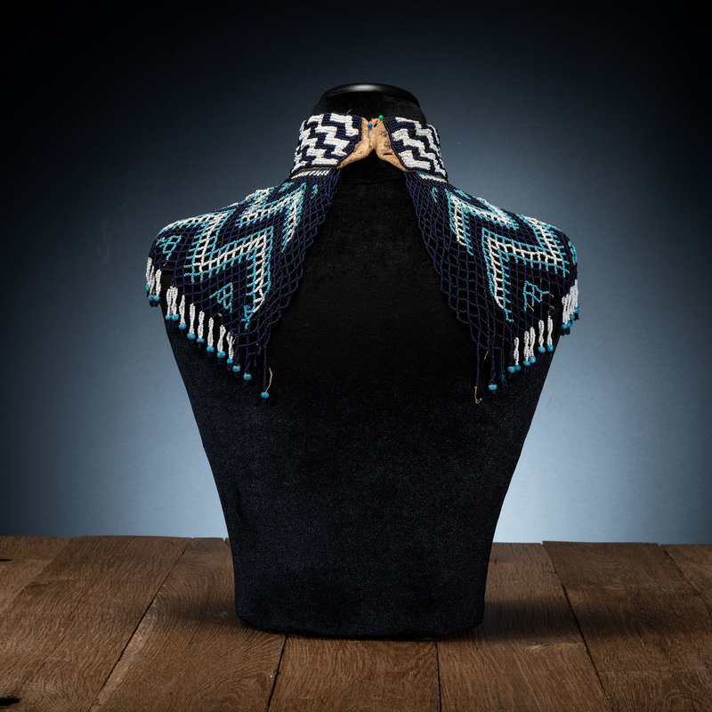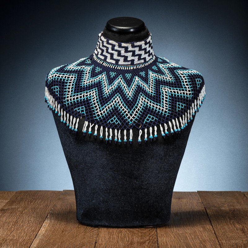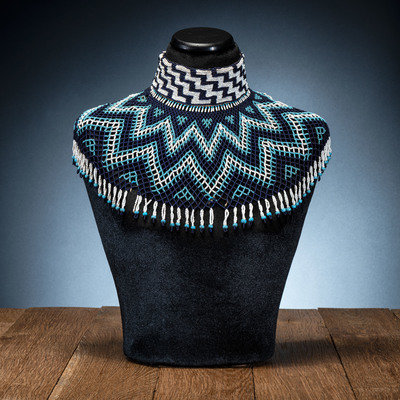 netted-stitch with glass beads in colors of cobalt, dark blue, medium blue and light blue, and white; neck piece lined with linen