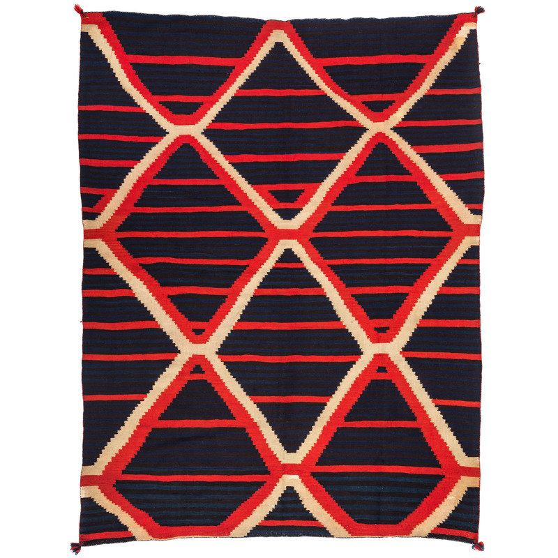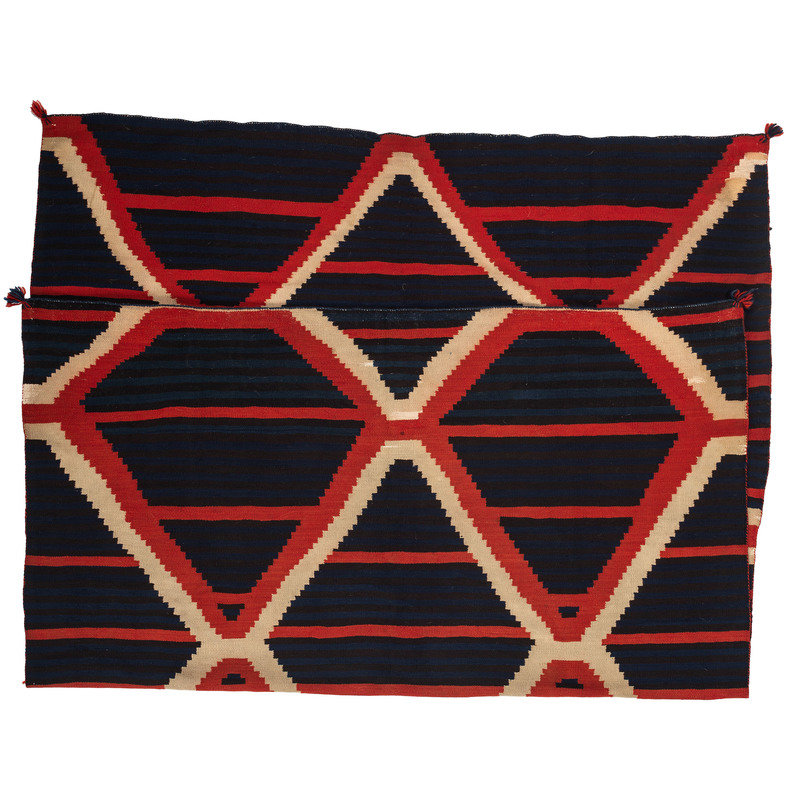 finely woven of handspun Merino wool in cream, dark brown, indigo, and red raveled American flannel; designed with a pattern of stepped diamonds against a finely banded ground