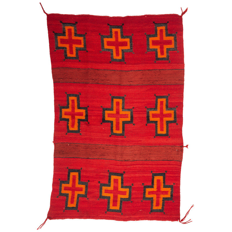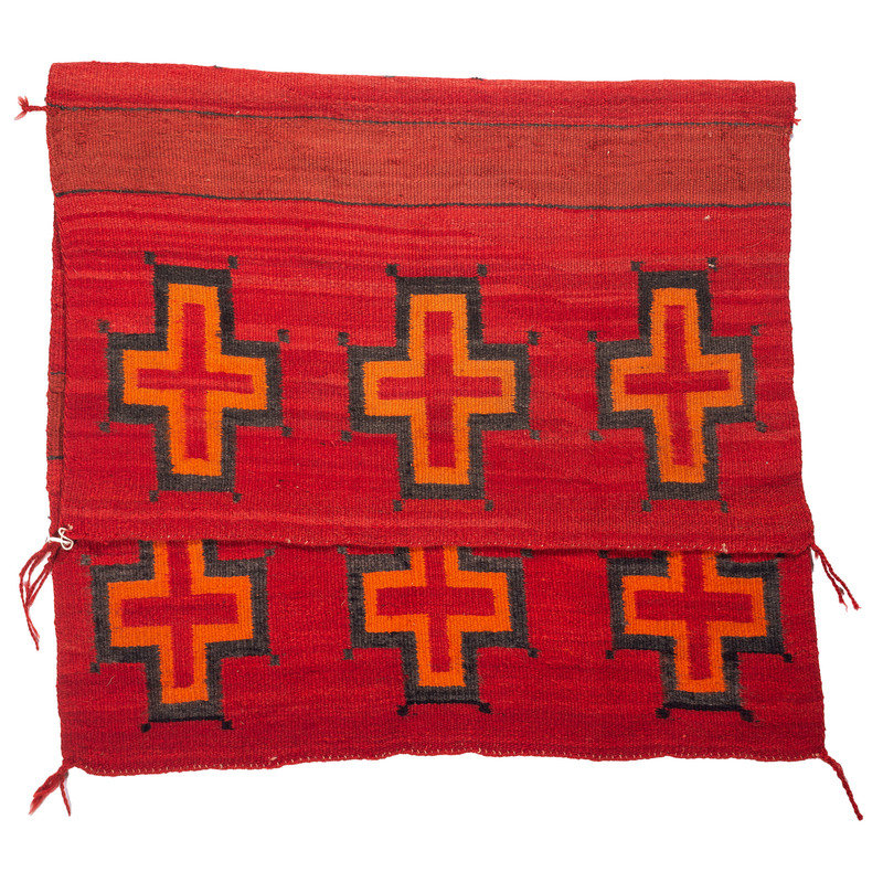 hand-spun wool in colors of red, orange, and black; with three bands of Spider Woman crosses