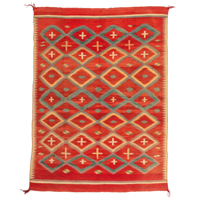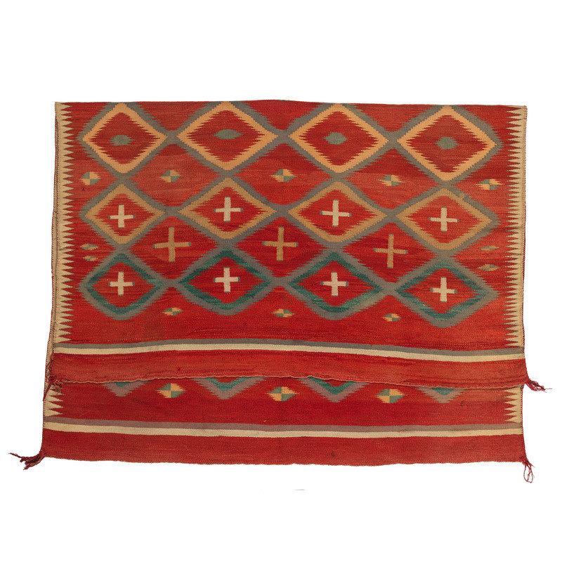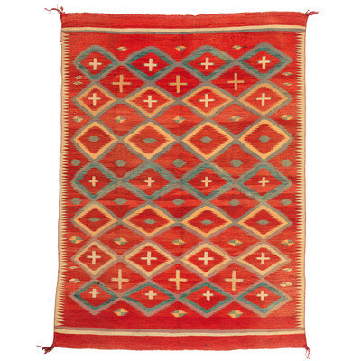 woven of hand-spun and Germantown wools in colors of cream, aniline red, and green; designed with serrated diamonds and crosses