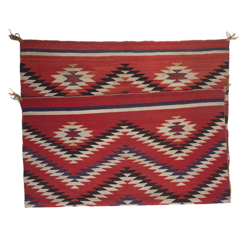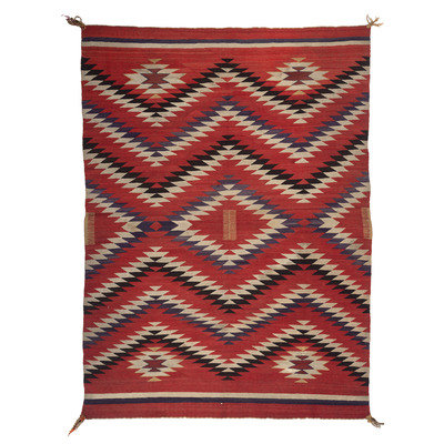 hand-spun wool having a flat weave; design in colors of blue, cream, black, and yellow against a red ground; serrated bands and diamonds fill the field