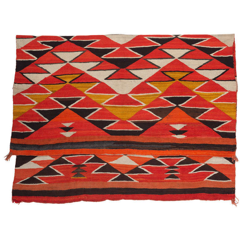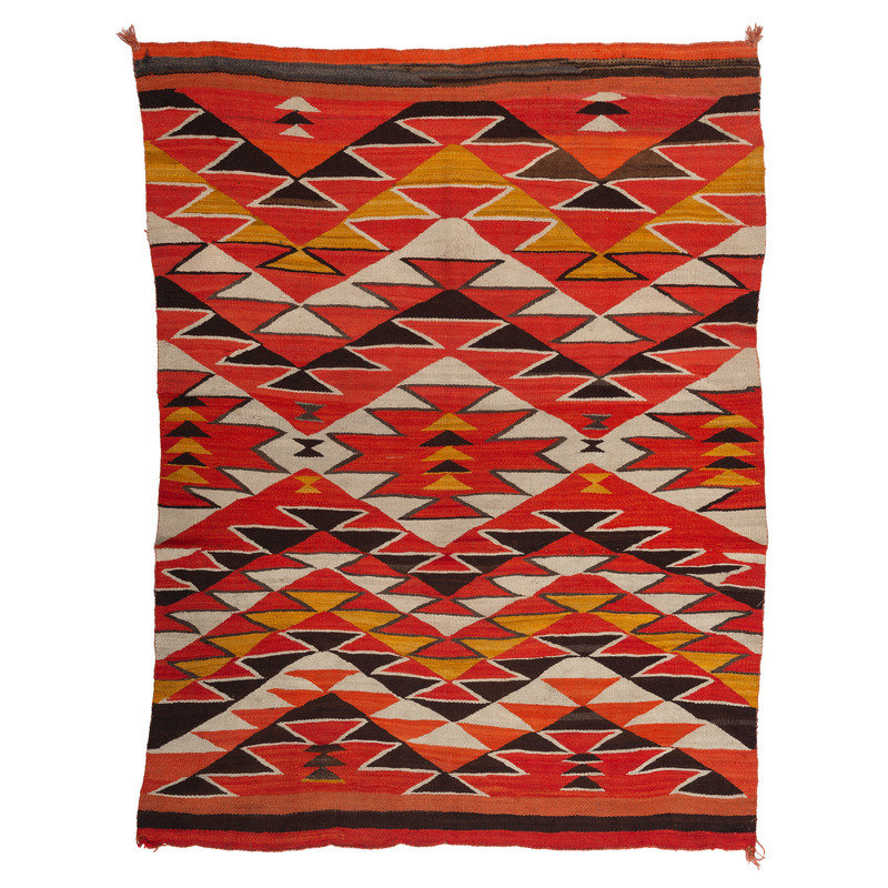 softly woven using colors of red, cream, yellow, black, and a hint of blue; banded pattern of bold zigzags