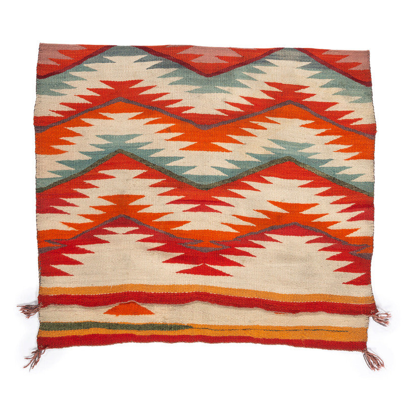 thick, soft hand-spun wool in colors of red, yellow, green, cream, orange, purple, and blue with a serrated banded design