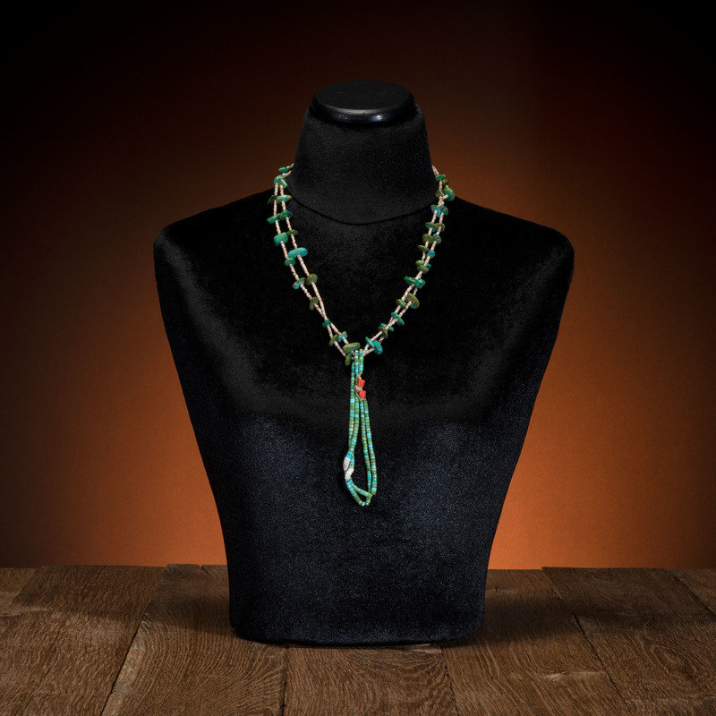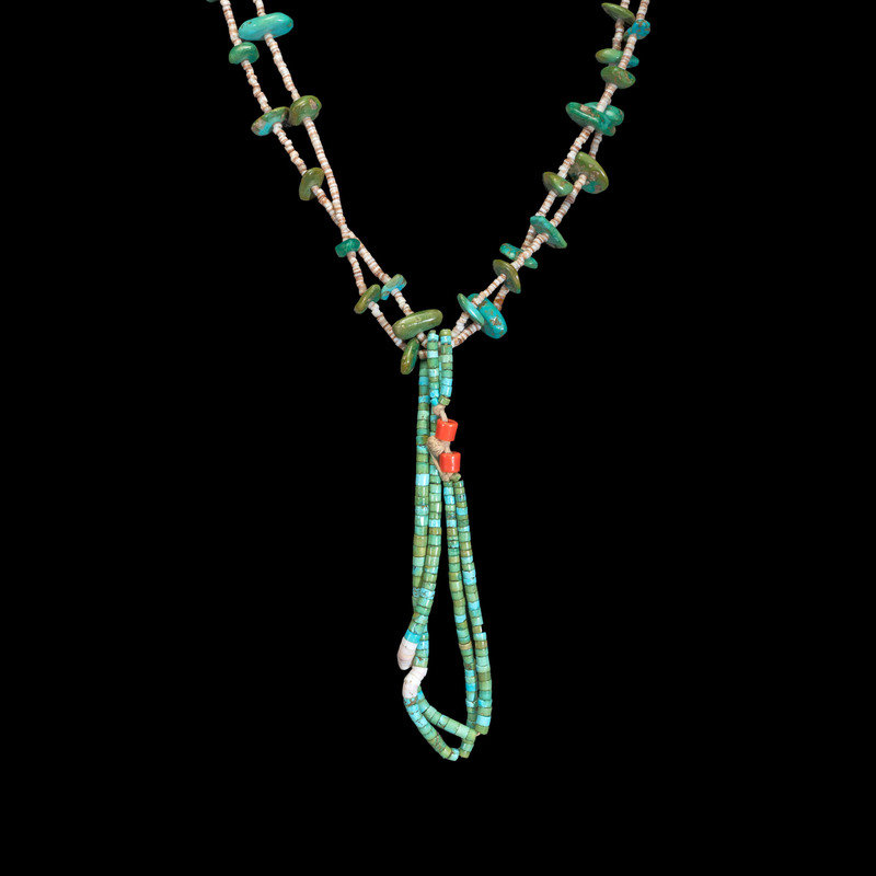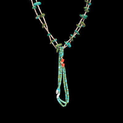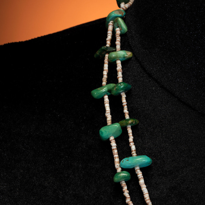 double-strand necklace with traditional cord wrapping; with heishi and turquoise nuggets and featuring a pair of rolled turquoise and shell joclas