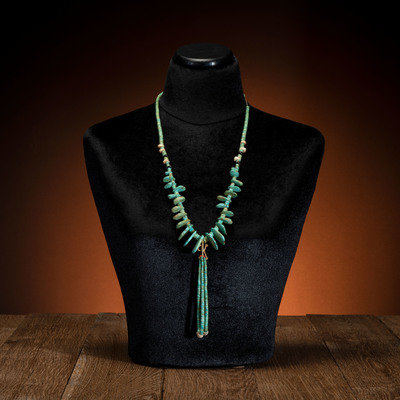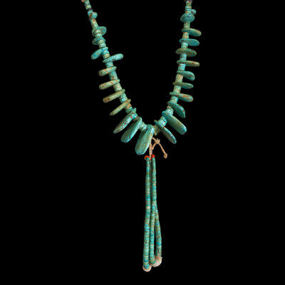 single-strand necklace, with graduated rolled turquoise spacers and tabs of bone, jet and turquoise