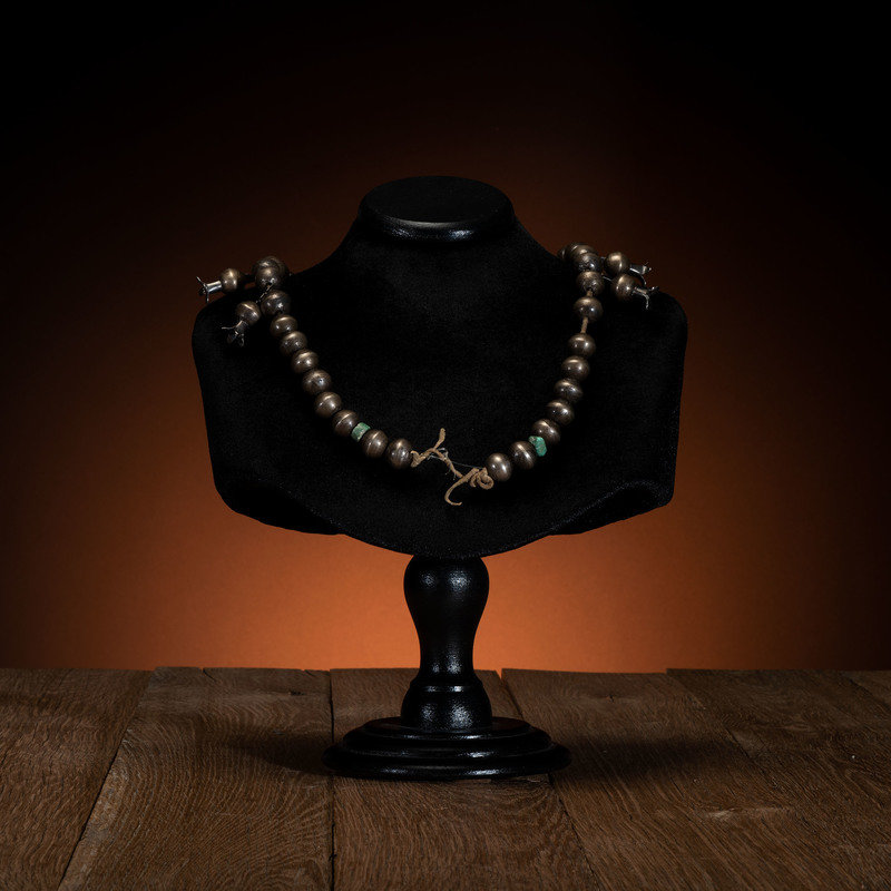 single-strand necklace strung on a hide thong with beads and blossoms crafted from Mexican silver pesos; featuring a slender sand cast naja