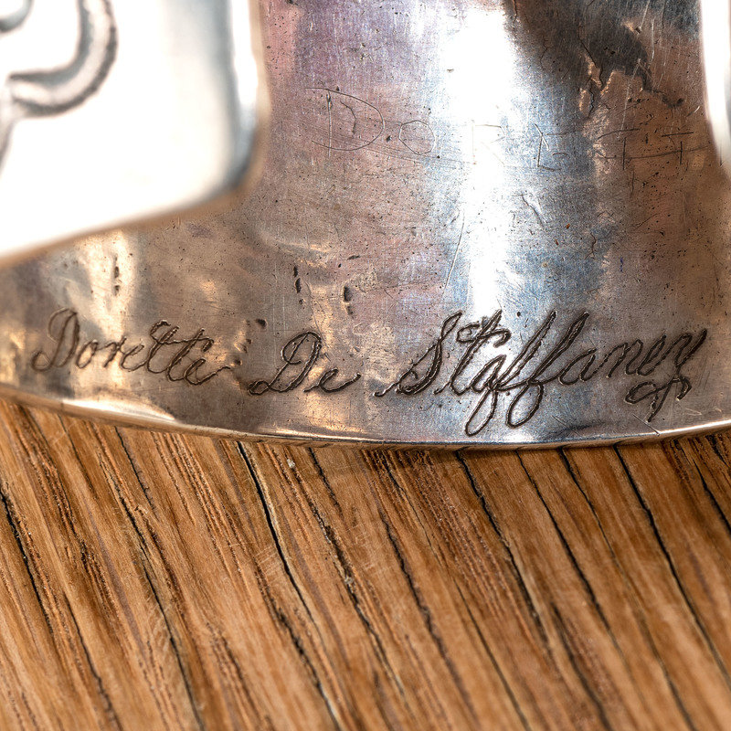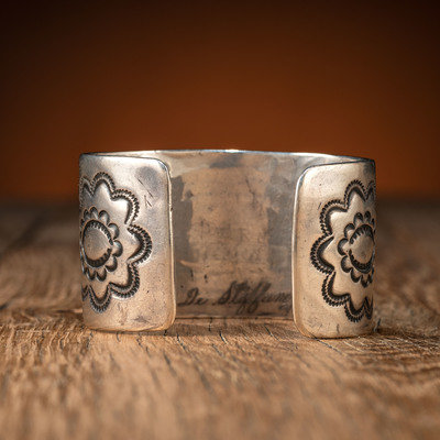 heavily stamped silver cuff; etched on the back reads Dorettie De Staffaney
