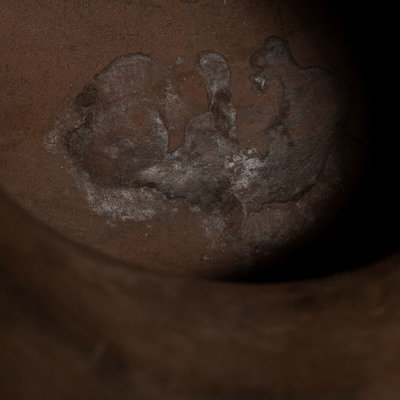 Sometime around 1900, Martina and Florentino begun using the rag-wiped slip of Cochiti Pueblo, which does not require polishing with a stone, and it appears that they introduced its use to other potters of San Ildefonso. By 1910, almost all white-slipped pottery of San Ildefonso was finished with Cochiti slip. An example of Martina and Florentino's work from this later period (figure 3) shows yet another turn-of-the-century development in San Ildefonso pottery that might be attributable to them. This is the jar shape with a squat, flared base and tall neck, which was popular at neighboring Santa Clara Pueblo in the late 19th century. Beginning around 1900 this shape was adopted by San Ildefonso potters, and by 1910 it has begun to supplant the spherical shape which had been predominant since the late 18th or early 19th century. Martina and Florentino were among the first potters to make jars of this new shape. (Struever and Batkin 1997: pg. 15, fig. 3)