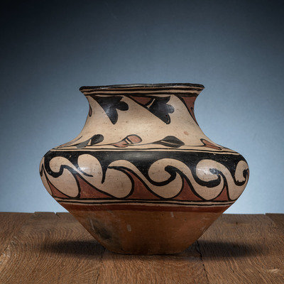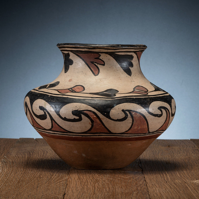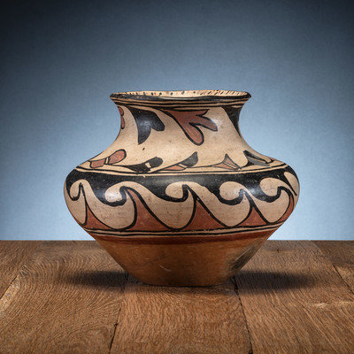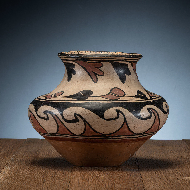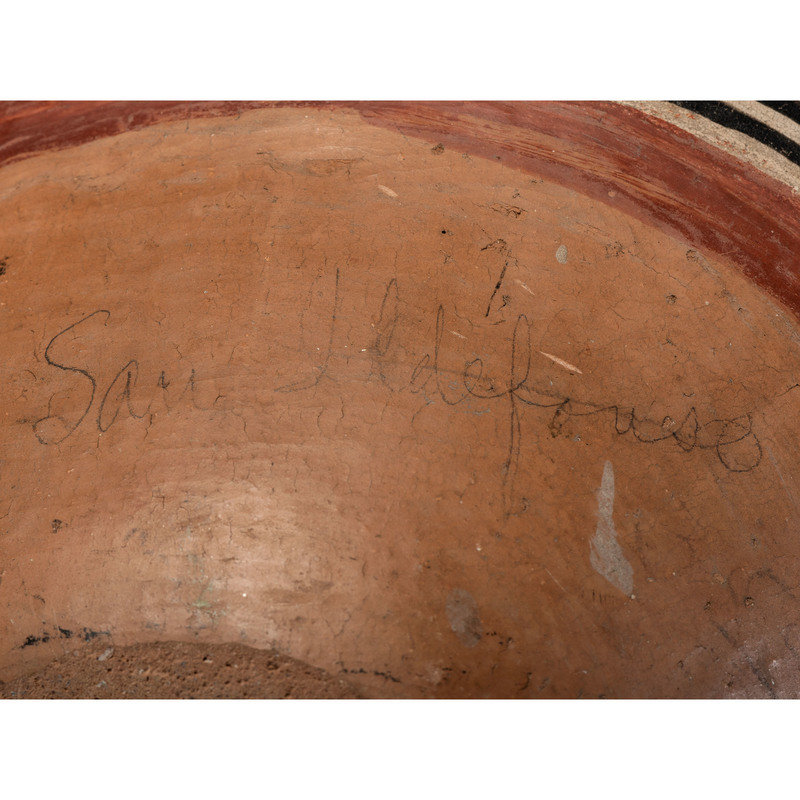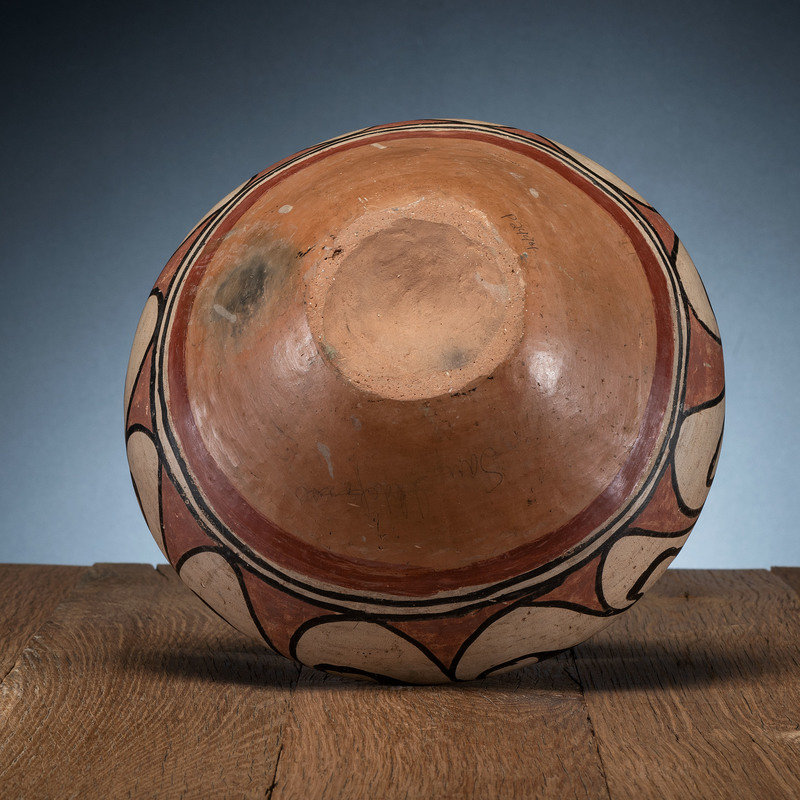 tapered body with sharp shoulder and flared neck; painted with floral elements and dots on interior of rim; collection number penciled near base
