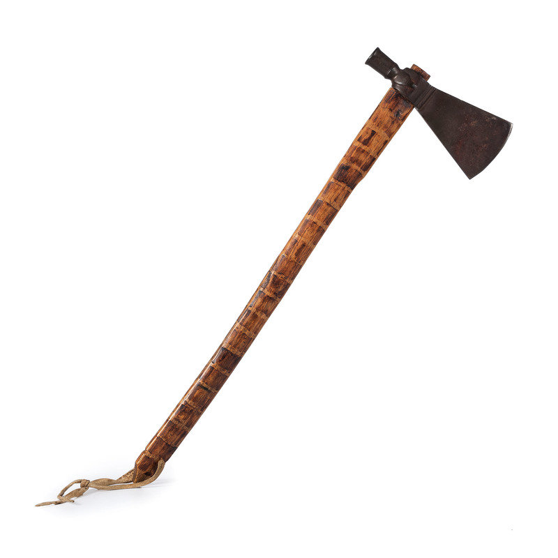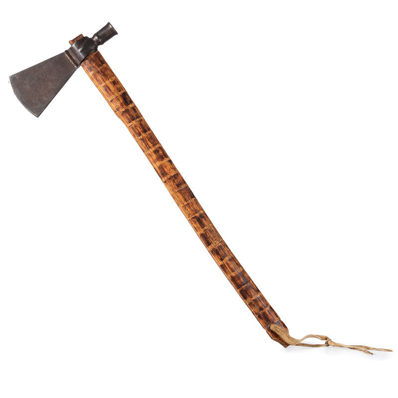 cast blade with cylindrical bowl; haft heavily file-branded and with buffalo hide thong wrist strap