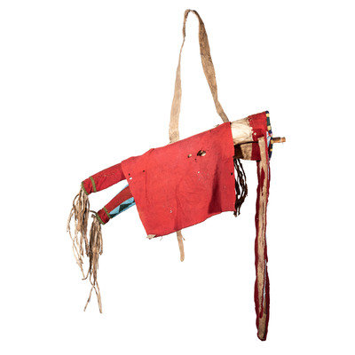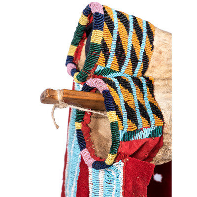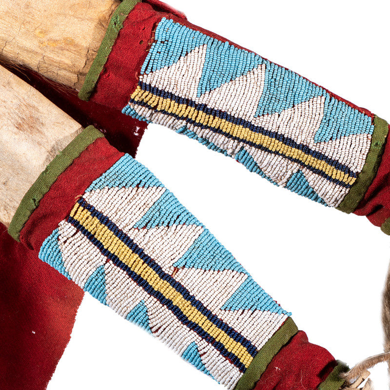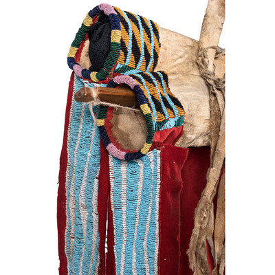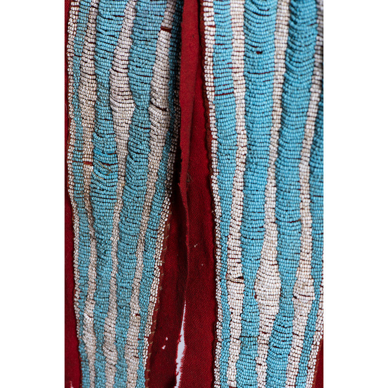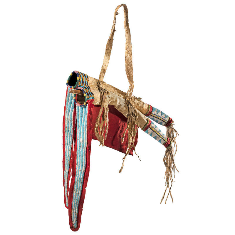 thread and sinew-sewn; having red wool trade cloth on triangular tabs and cuffs; beadwork in colors of sky blue, white, black, greasy orange, greasy yellow, greasy pink, translucent green and translucent navy; thin strips of otter fur cascade from each side of the strap and the ends of the bowcase and quiver