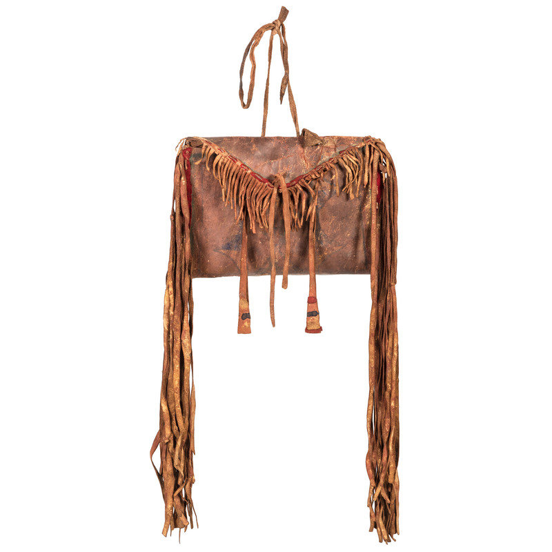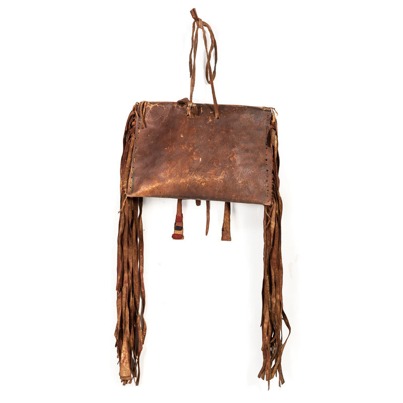 geometric design painted in red, blue, and green; sides and opening flap laced with buffalo hide fringe and edged with red trade wool; coated with orange pigment