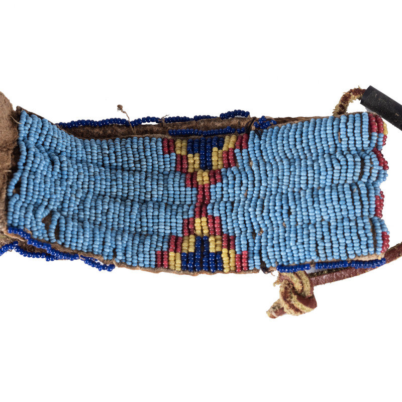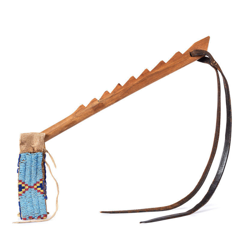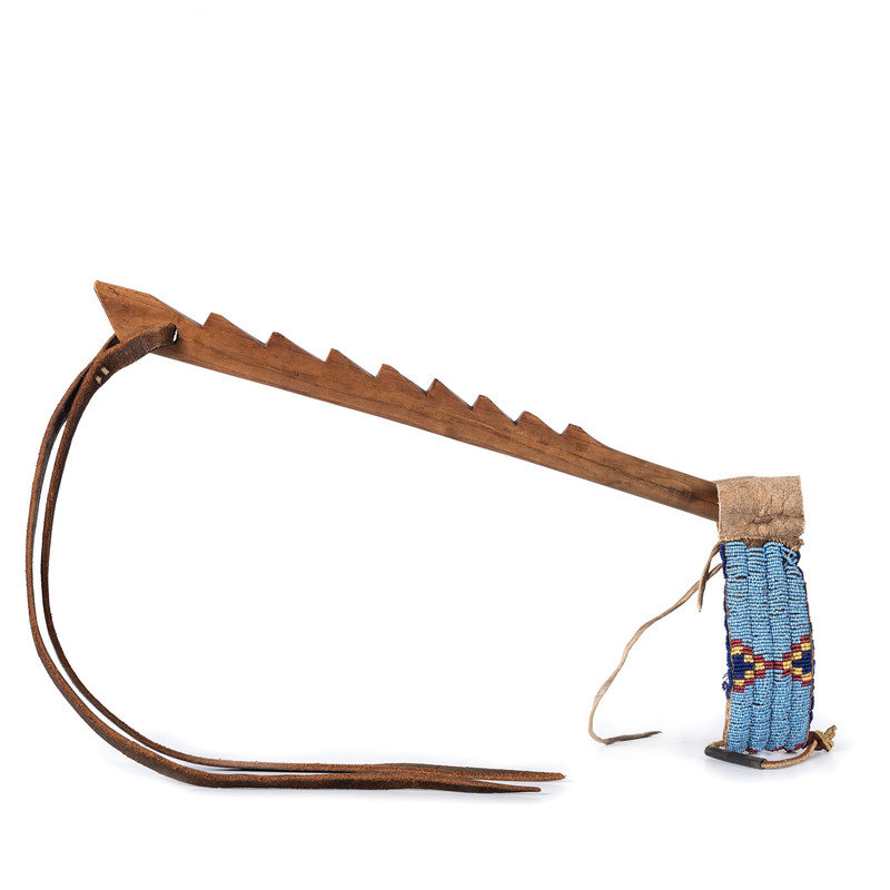 tapered and serrated form with harness leather lashing; sinew-sewn wrist strap having a geometric design beaded in colors of red white-heart, navy blue, yellow, and periwinkle
