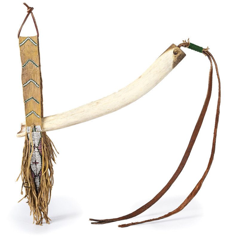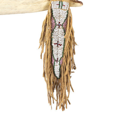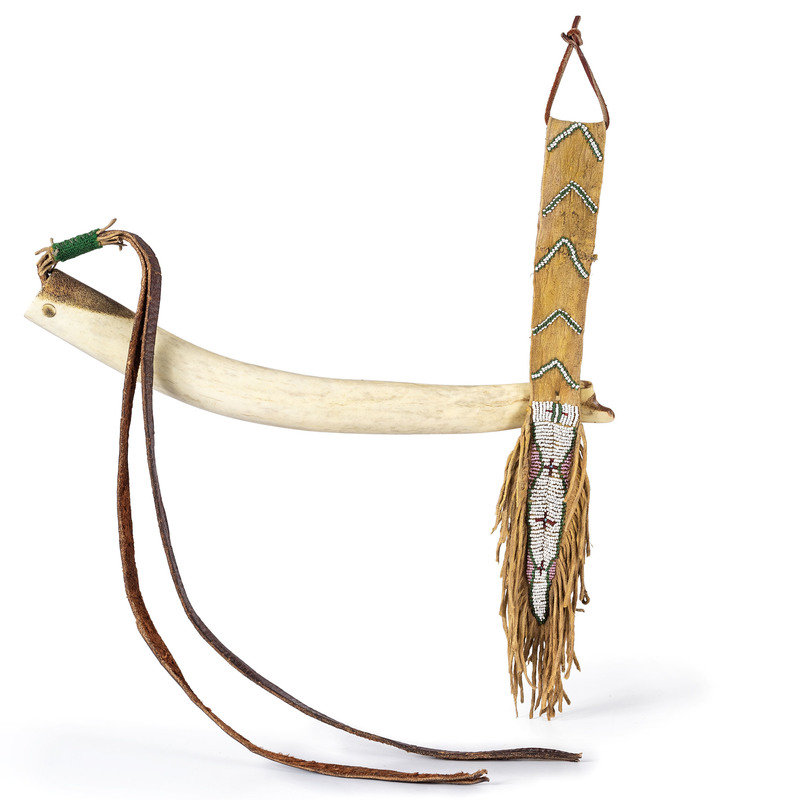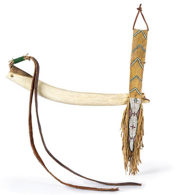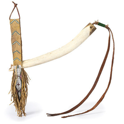 undecorated antler with harness leather lashing; sinew-sewn wrist strap coated with yellow pigment and fringe accents; design beaded in colors of pea green, white, translucent red, greasy pink, and light blue