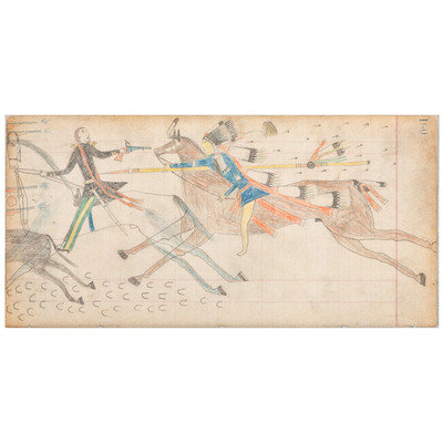 depicts warrior on horseback with lance, charging a U.S. soldier; the soldier also on horseback, has gun drawn, bullets flying