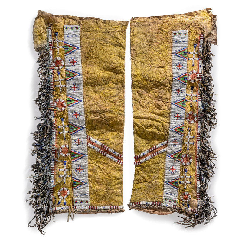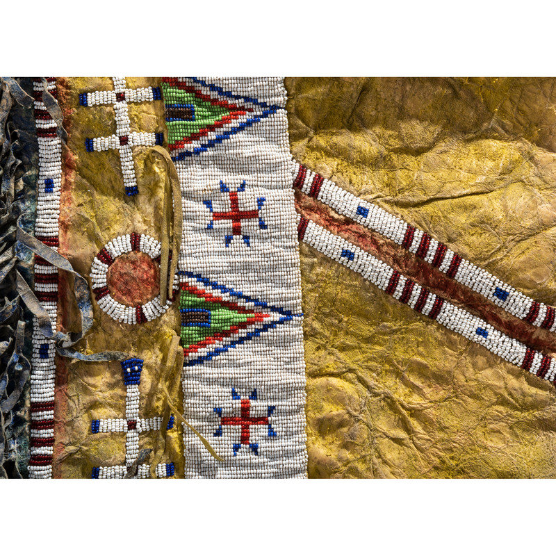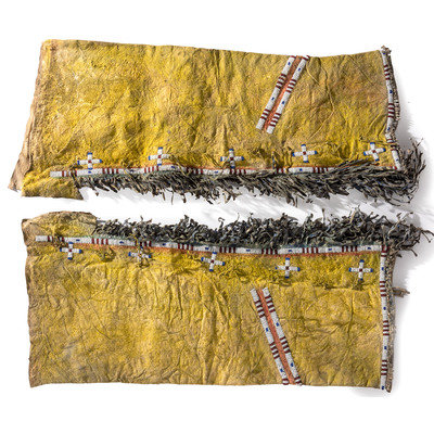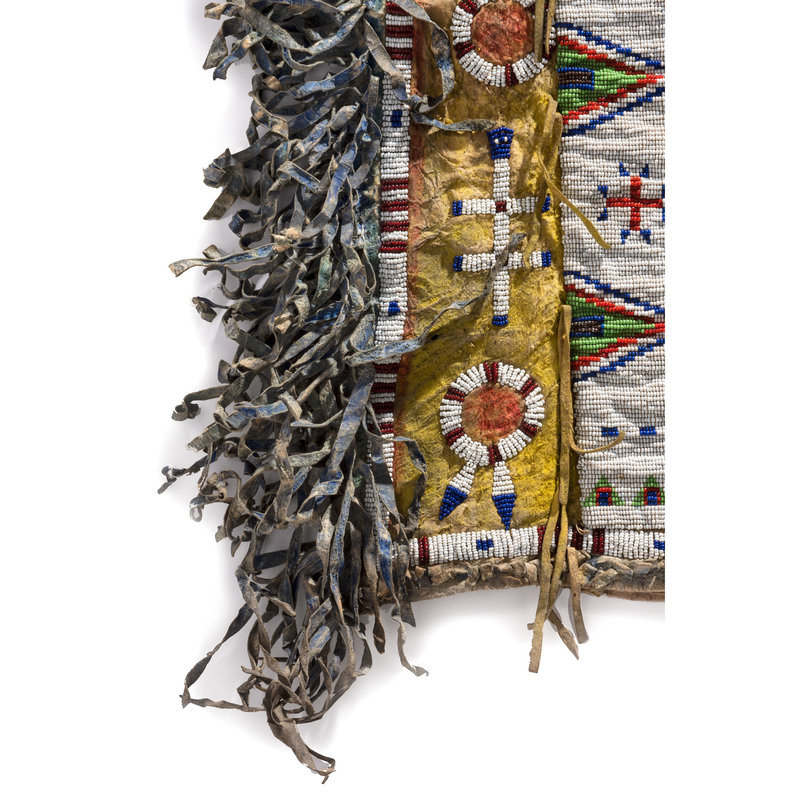 thread-sewn and beaded in white, rose, red, dark blue, and pea green; hide enhanced with yellow, blue, and red pigments; interior lined with cotton, remnants of red pigment in interior
