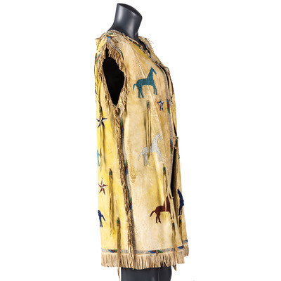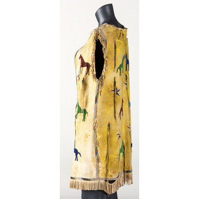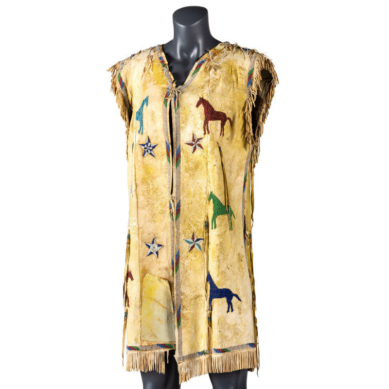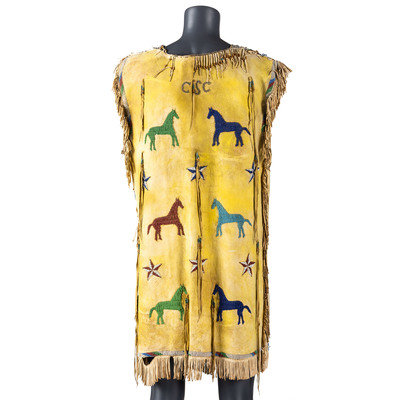 thread-sewn and assembled using multiple hide panels; beaded with 12 horses and ten stars, and with the initials CSC, in colors of deep red white-heart, dark, medium, and light blue, pea green, and white; hide retains yellow pigment