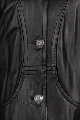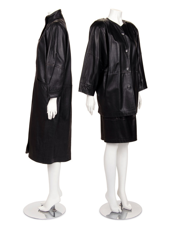 Black leather long jacket with rounded stand collar, dolman sleeves with rolled up cuffs, front inseam hip pockets, and center front button closure; paired with matching straight fit skirt.