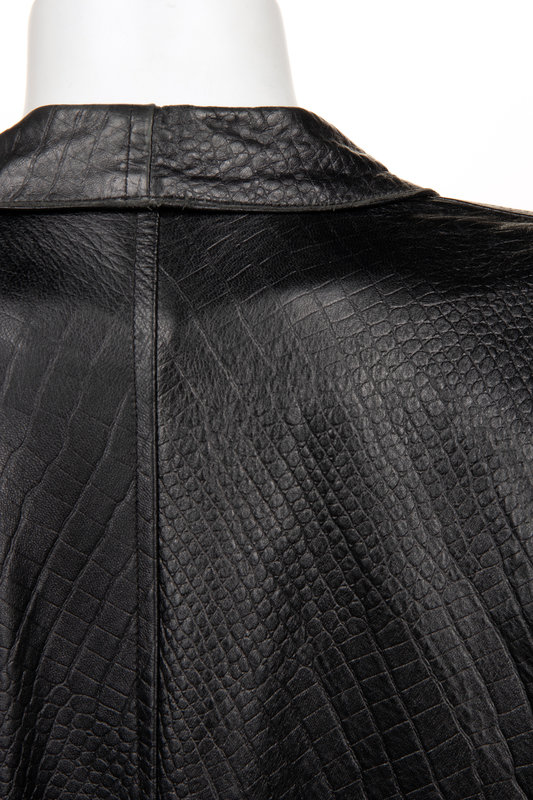 Black lizard skin embossed leather kimono style jacket with shawl collar, tapered cuffed sleeves, front waist pockets, and open front.