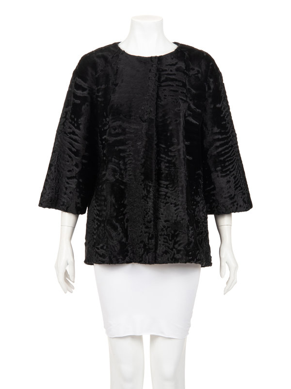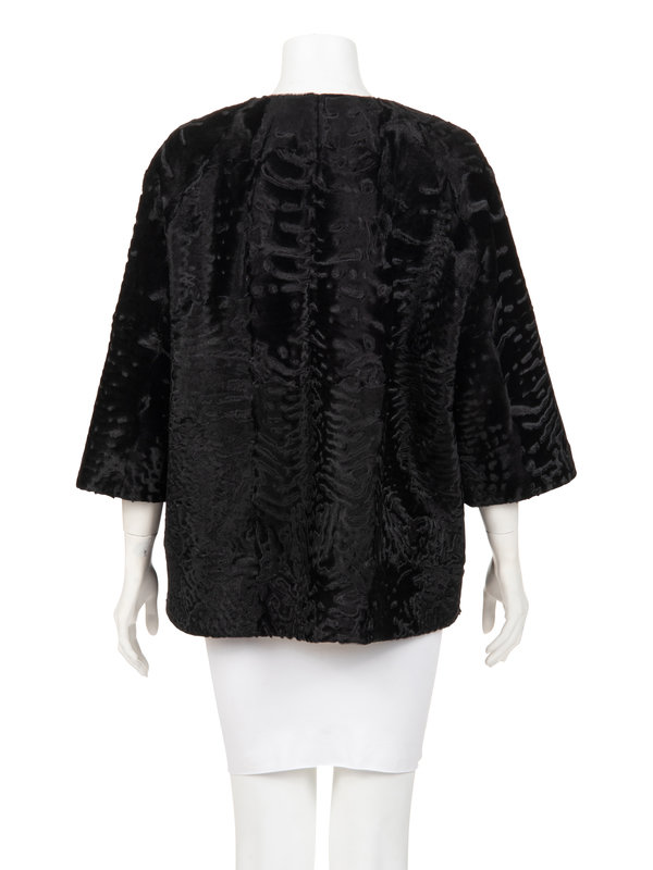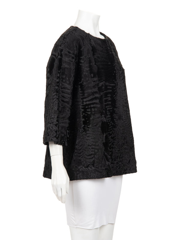 Black Afghan lamb swing jacket with clean jewel neckline, raglan 3/4 length sleeves, front slit pockets, and center front neckline snap closure.