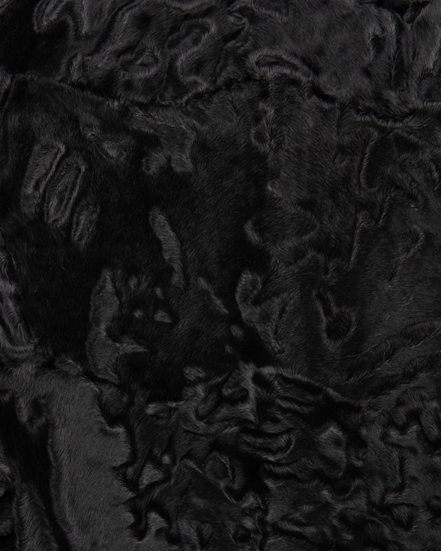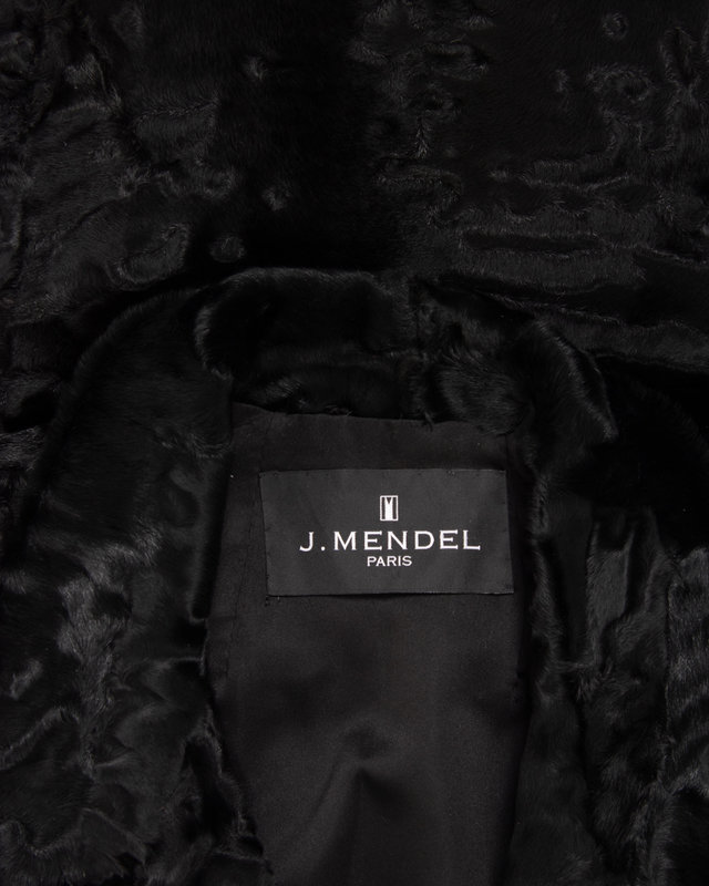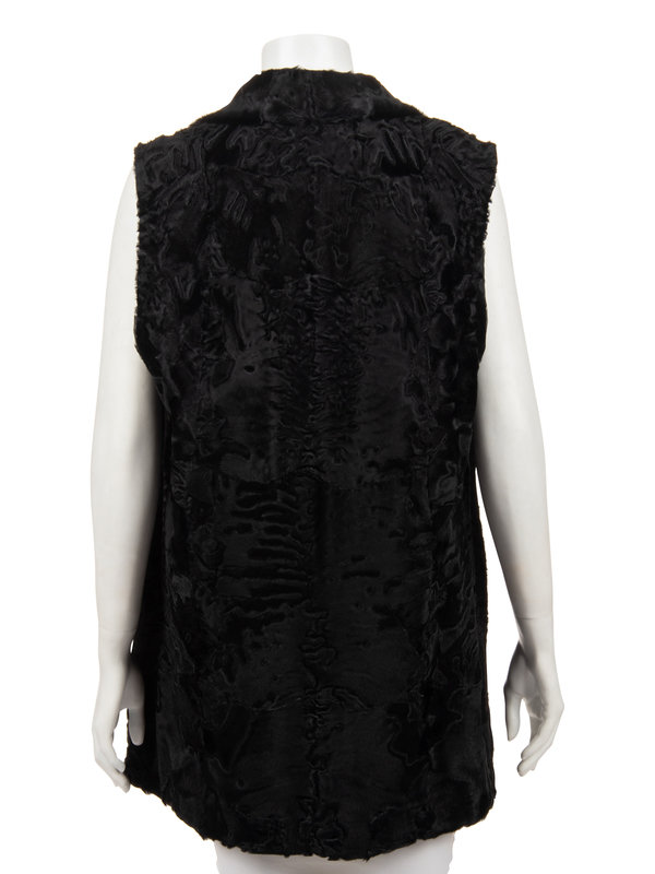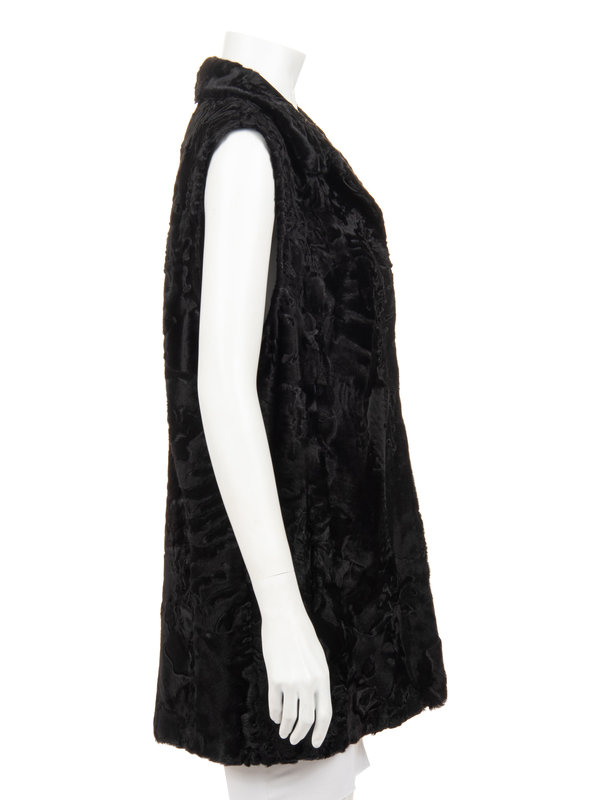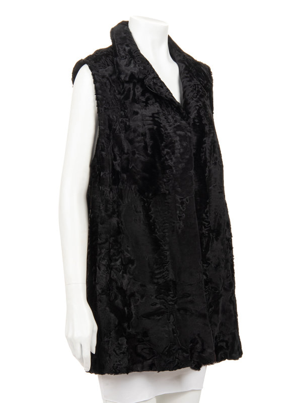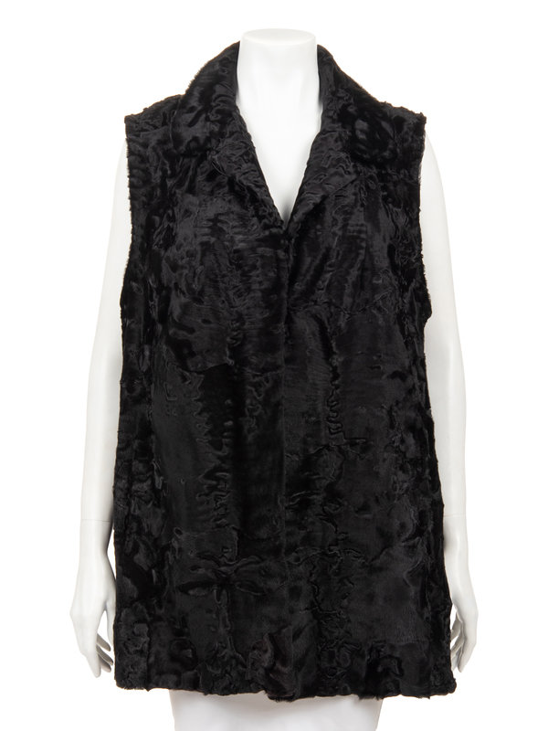Black broadtail sleeveless tunic with club collar, front welt pockets, and single front hook and eye closure. "Michelle" monogrammed on front right lining.
