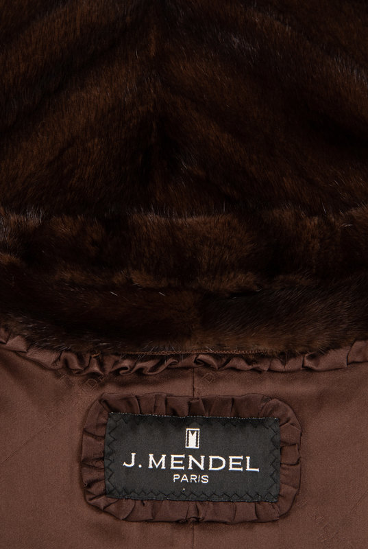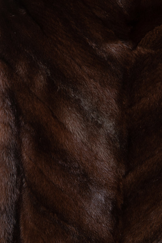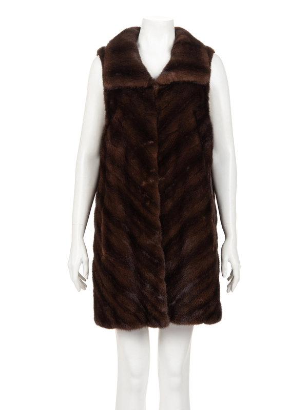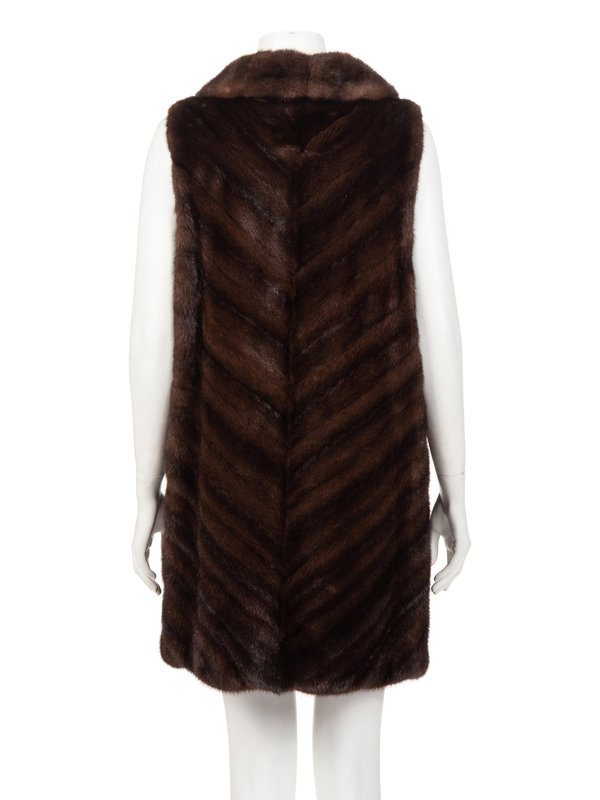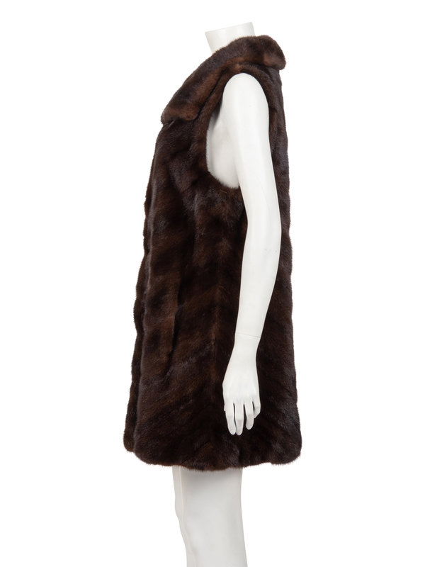 Brown chevron patterned mink fur sleeveless vest with exaggerated rolled collar, front waist inseam pockets, and center front hook and eye closure. "Michelle" monogrammed on front right lining.