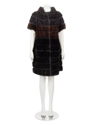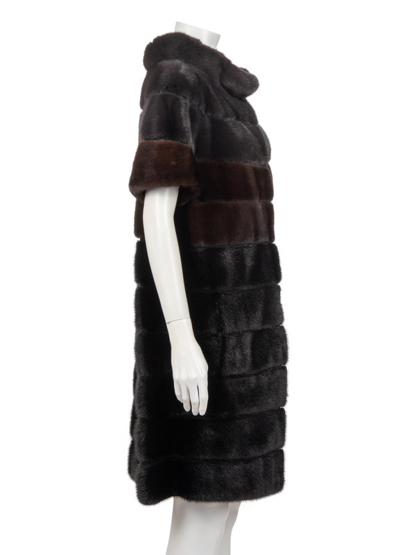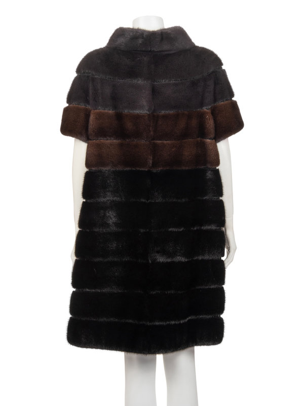 Black, grey, and brown mink fur banded jacket with built-up funnel collar, dropped shoulder short sleeves, and center front hook and eye closure.