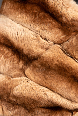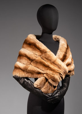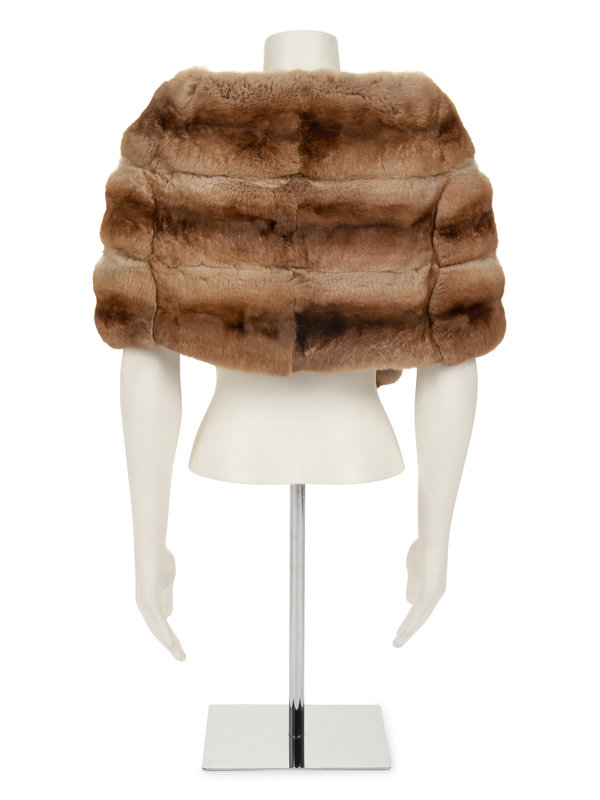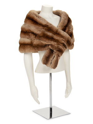 Tea-dyed chinchilla fur stole lined in silk satin with looped end to secure at center front.