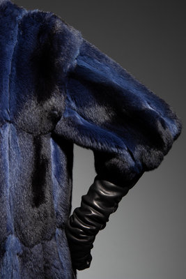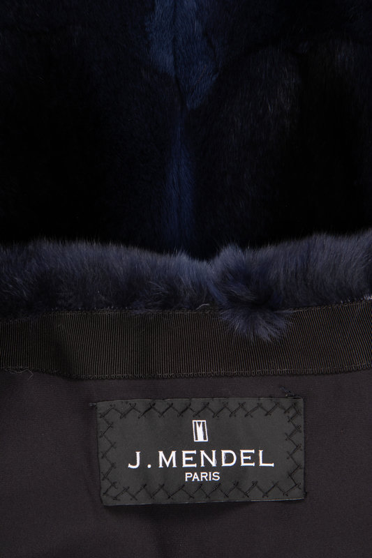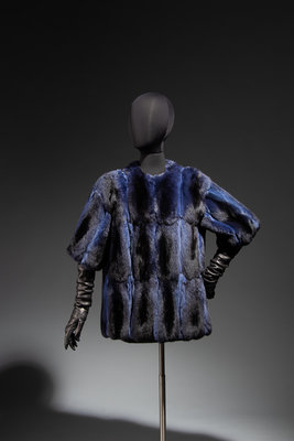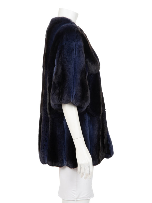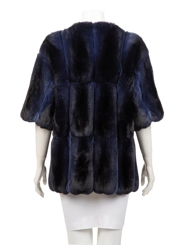 Blue and black chinchilla short sleeve jacket with hook and eye closure down center front.
