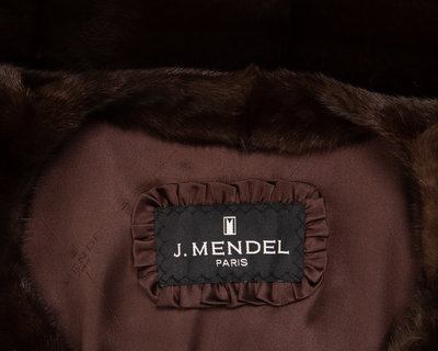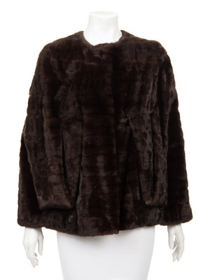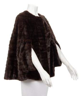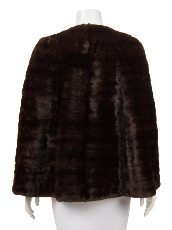 Brown ermine fur capelet-style jacket with slit arm openings and front neckline hook and eye closure. "Michelle" monogrammed on front right lining.