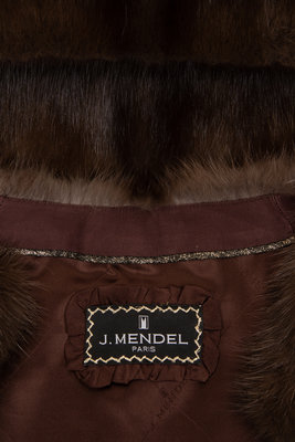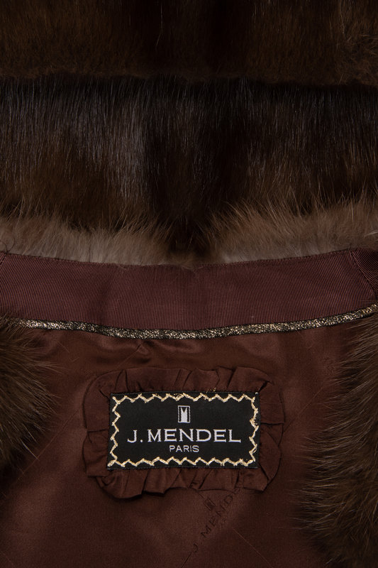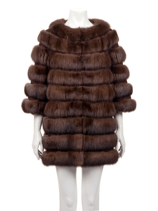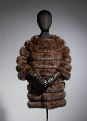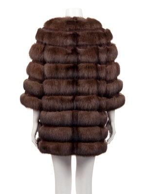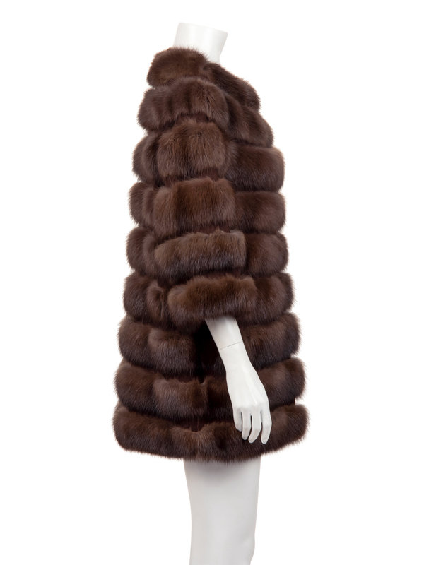 Natural Barguzine sable fur and suede banded stroller coat with wide jewel neckline, and center front hook and eye closure. "Michelle" monogrammed on interior front right lining.