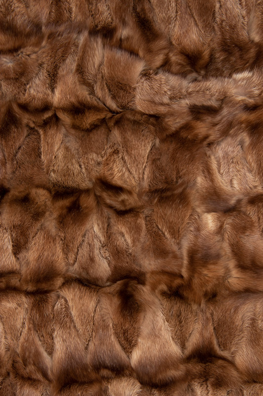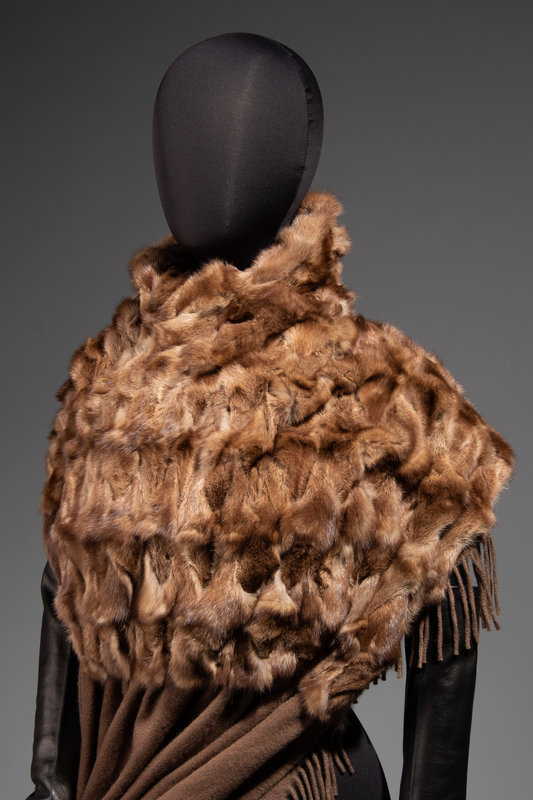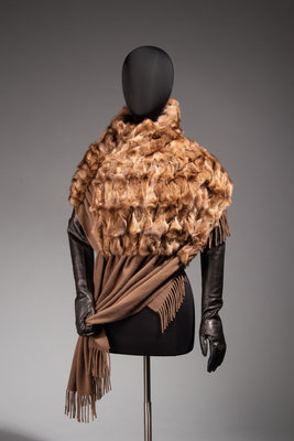 Brown cashmere fringed shawl backed with variegated brown rabbit fur.